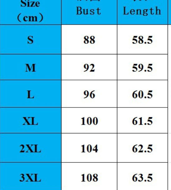 Size:S,M,L,XL,2XL,3XL unit:cm