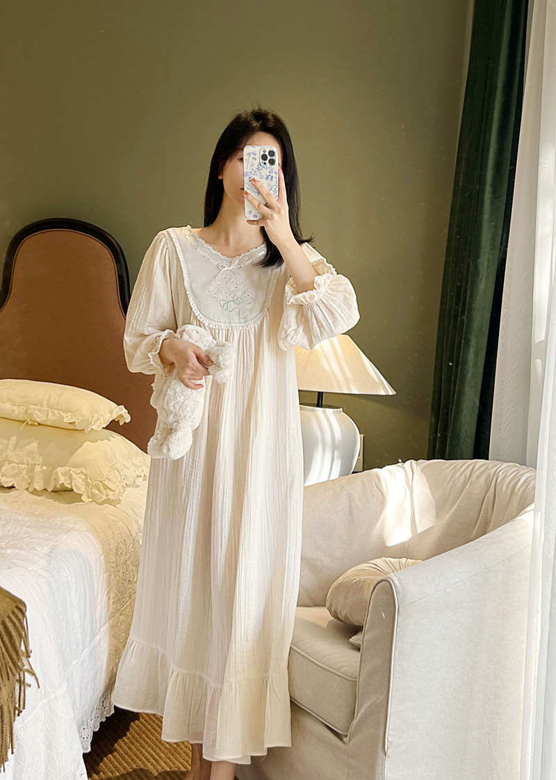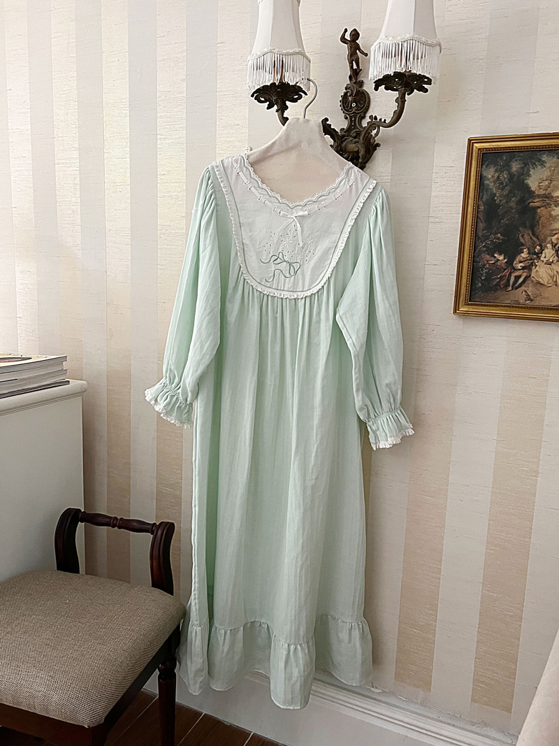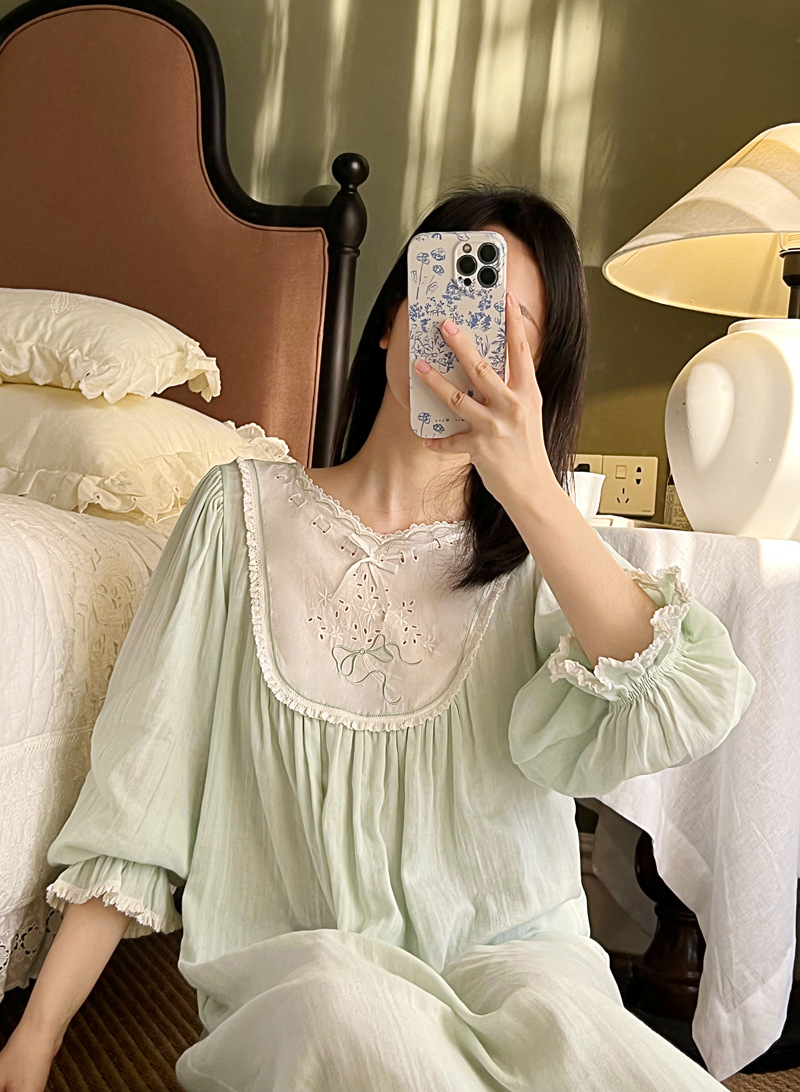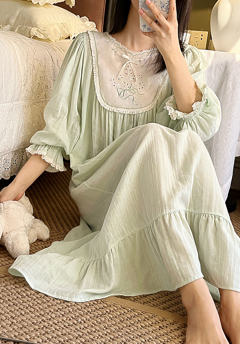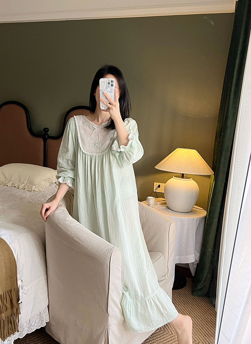 Product information: Fabric name: Cotton Color: Almond, fog Green Size: S,M,L,XL Sleeve length: long sleeve Style: nightdress Style: Court retro style
