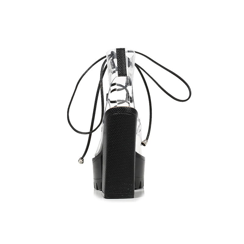 Upper material: PVCSole Material: Rubber Style: Europe and AmericaToe shape: fish mouthHeel height: super high heel (above 8CM)Heel shape: thick heel