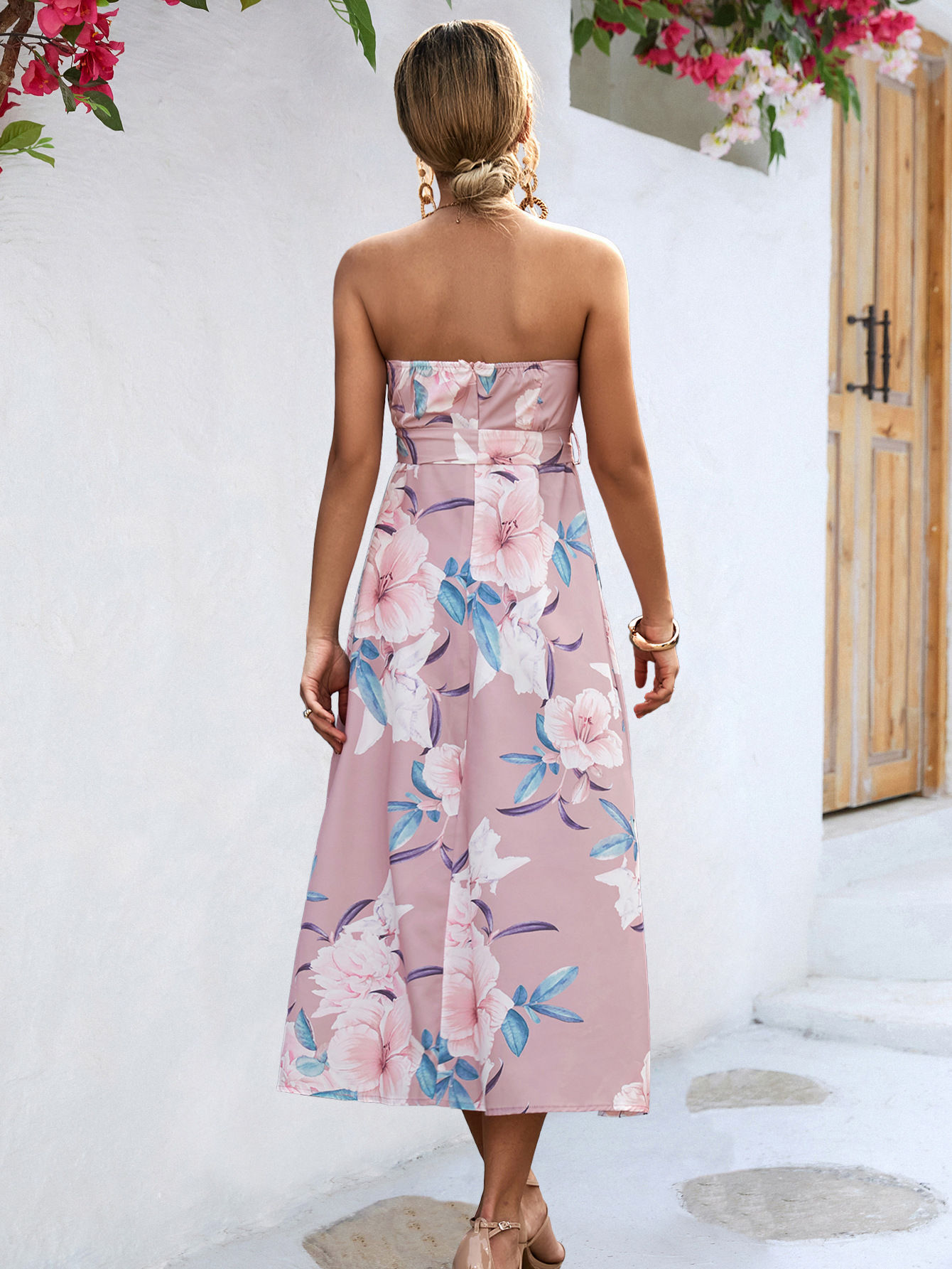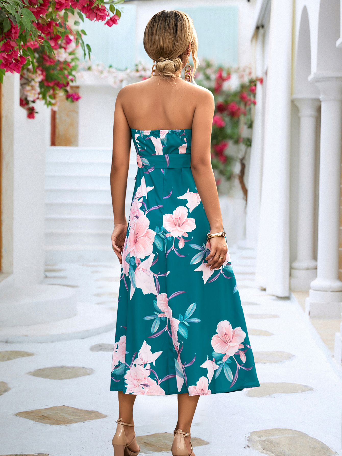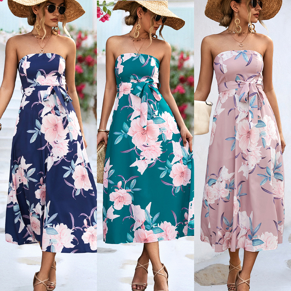 Product information: Pattern: plants and flowers Color: pink, green, dark blue Waist type: high waist Size: S,M,L,XL Fabric name: Polyester Skirt Category: Dress Style: Elegant style