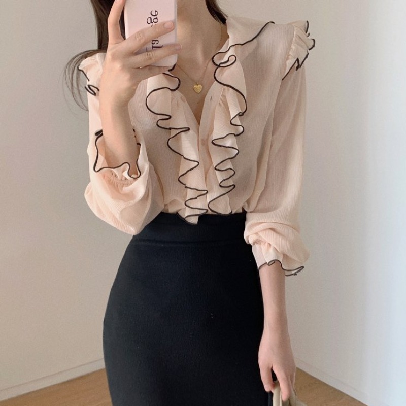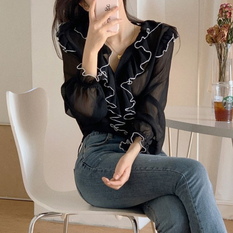 Product information:Main fabric composition: cottonPattern: plainStyle: ruffleColor: pink, blackSize Information:Size: one sizePacking list:Ladies top*1