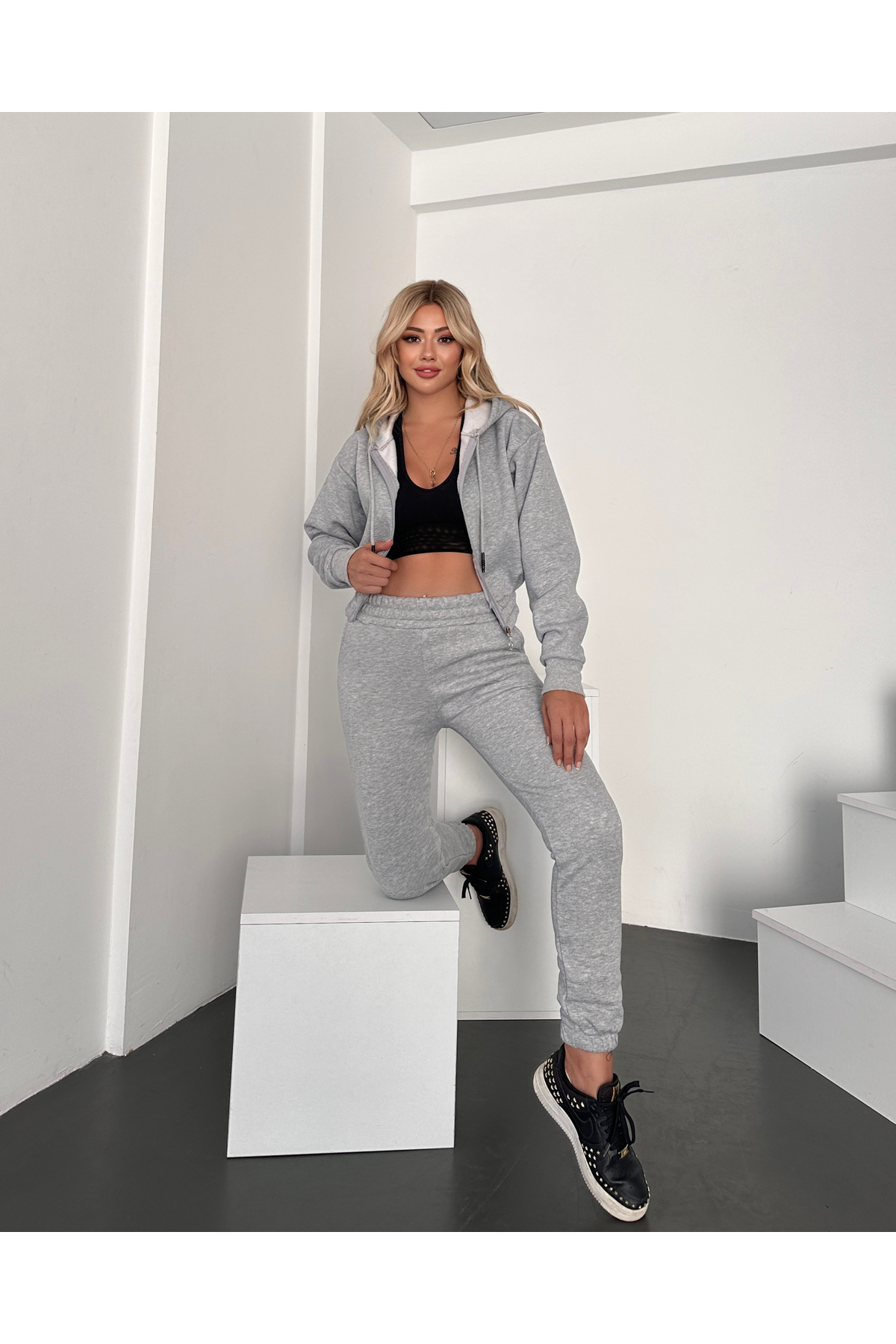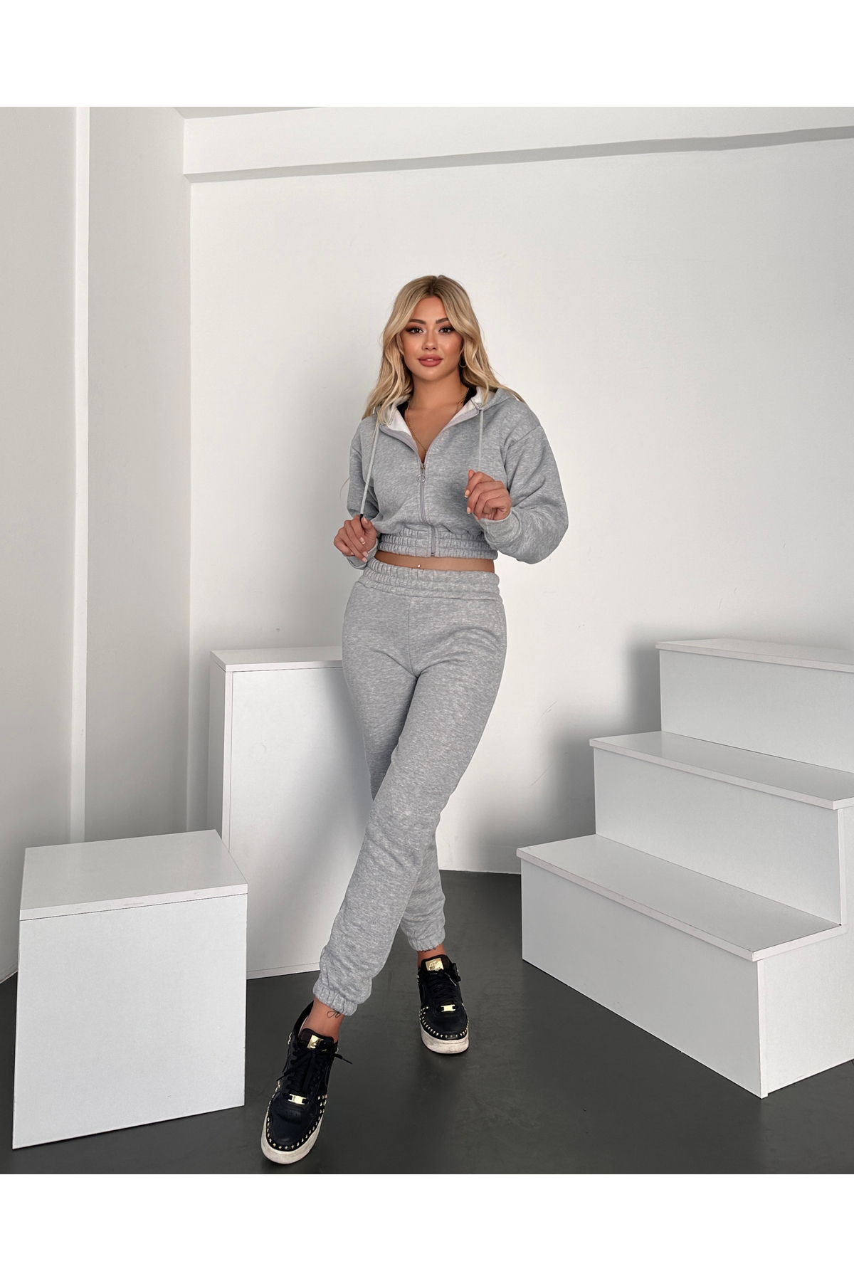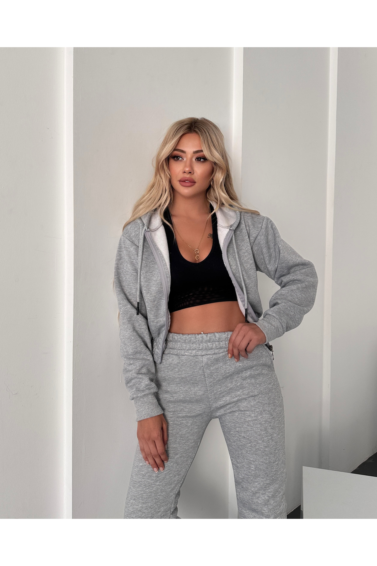 Women's Hooded Zippered Thick Crop Sweatshirt Tracksuit Set Gray