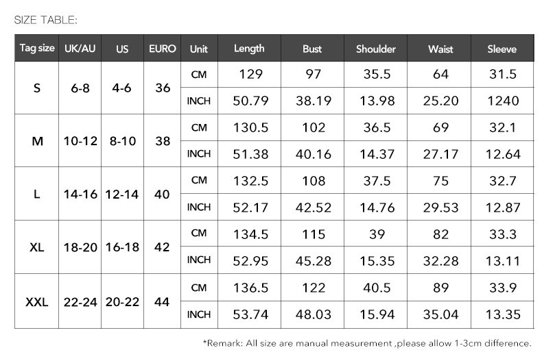 1. Asian sizes are 1 to 2 sizes smaller than European and American people. Choose the larger size if your size between two sizes. Please allow 2-3cm differences due to manual measurement. 2. Please check the size chart carefully before you buy the item, if you don't know how to choose size, please contact our customer service. 3.As you know, the different computers display colors differently, the color of the actual item may vary slightly from the following images.
