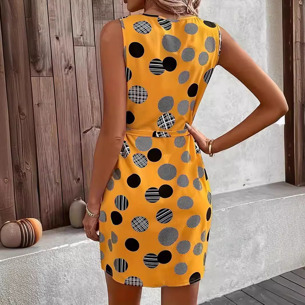 Retro Printed Lace Up Waist-tight V-neck Mid-length Dress Casual Style