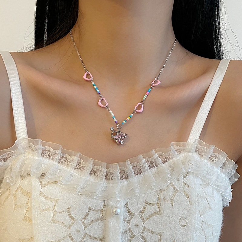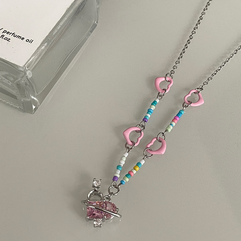 Product information:Color: pink heart color beaded necklaceApplicable people: womenPendant material: AlloyChain style: cross chainMaterial: titanium steelShape: heart shape,-1Popular elements: Love/heartStyle: sweet and cool