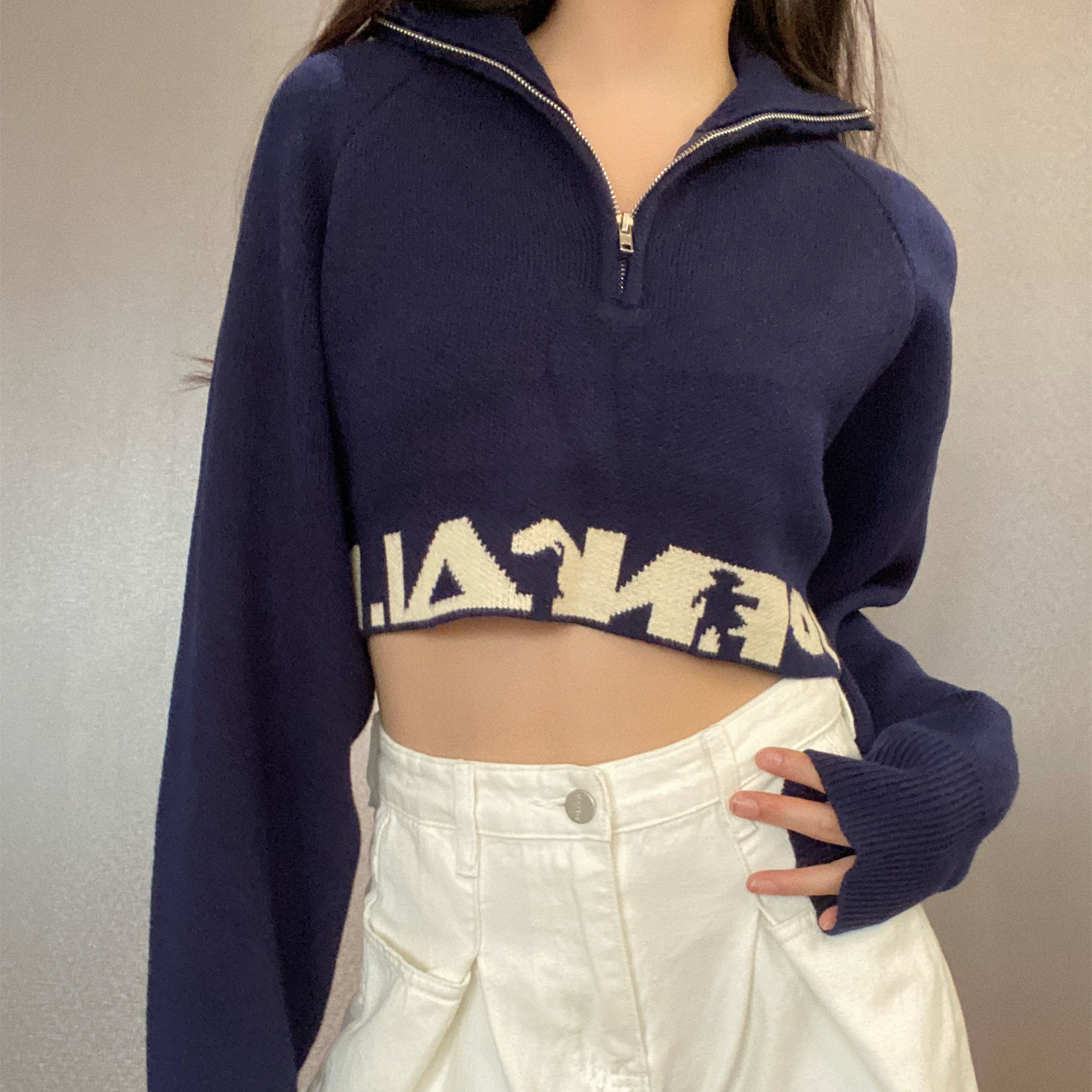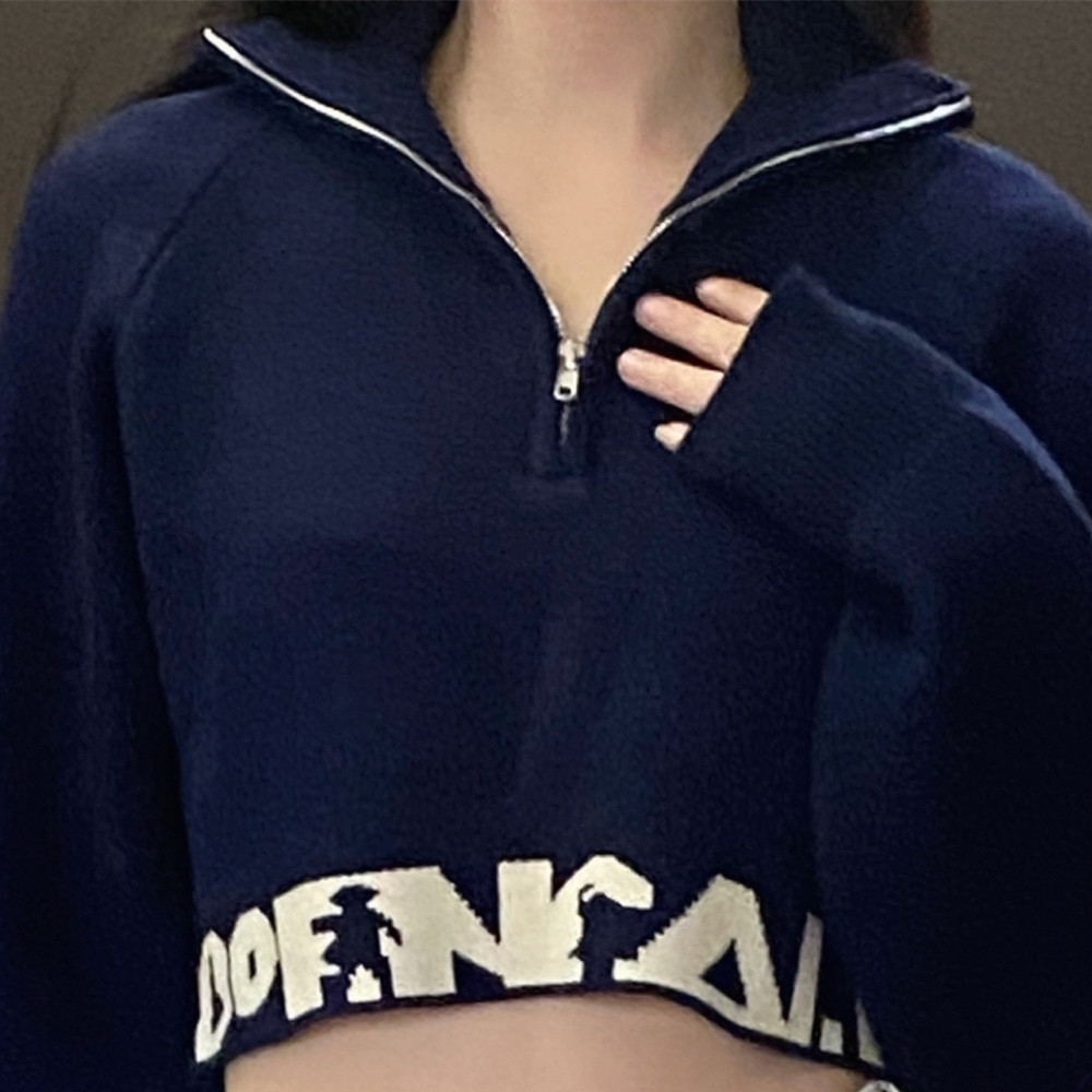 Women's Navy Blue Short Navel Thin Sweater