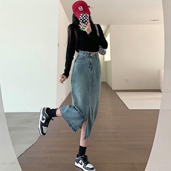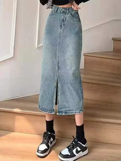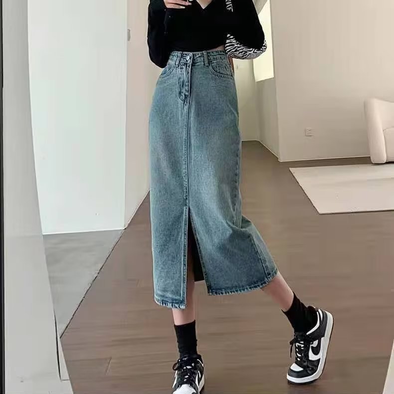 High waist slit denim skirt for women A-line slimming hip-covering design mid-length skirt