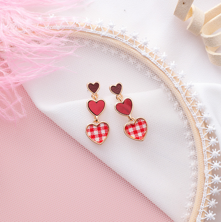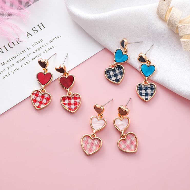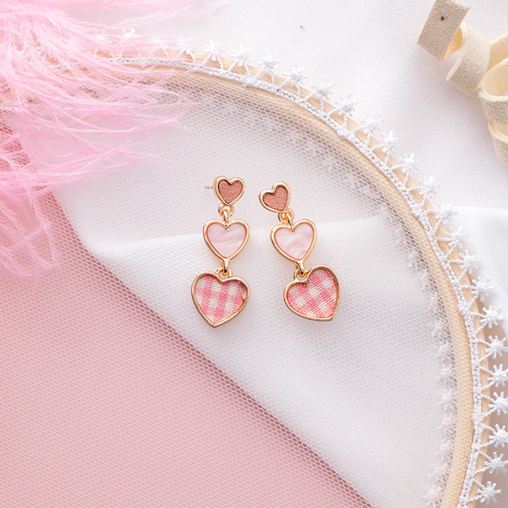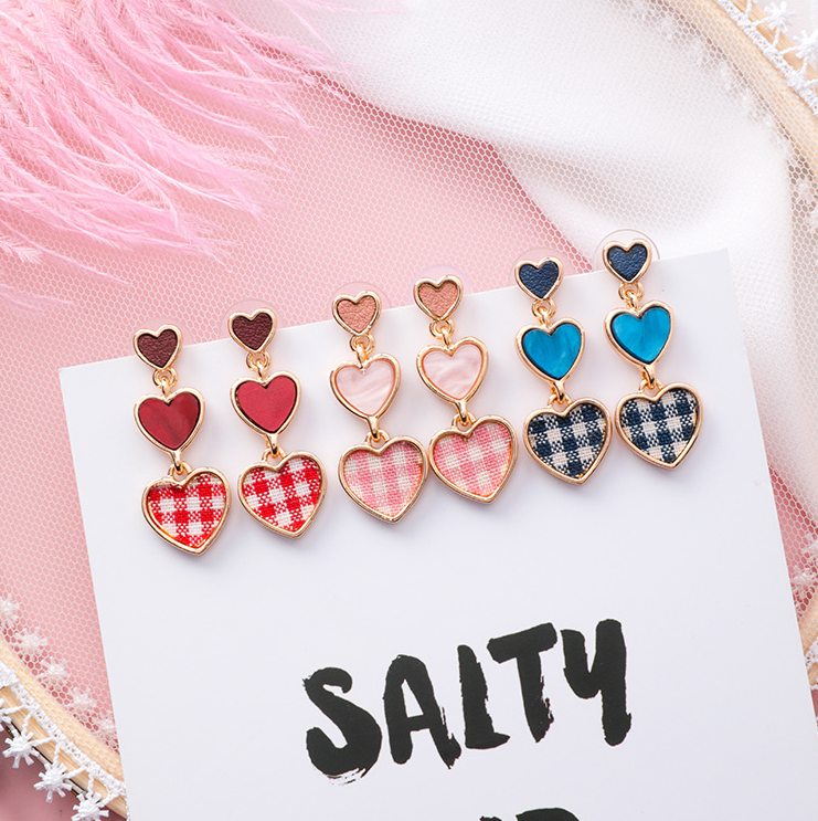 Colorful Plaid Fabric Love Earrings Korean College Style Sweet Girls Size Heart Earrings