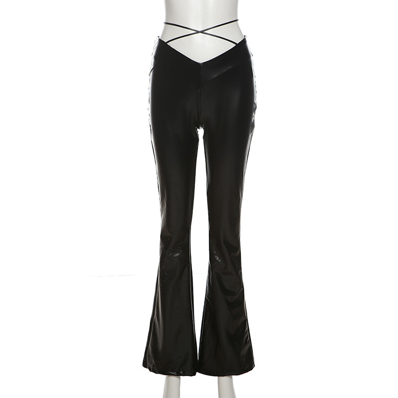 Slim PU Leather Casual Pants With High Waist Straight Leg And Wide Leg Strap
