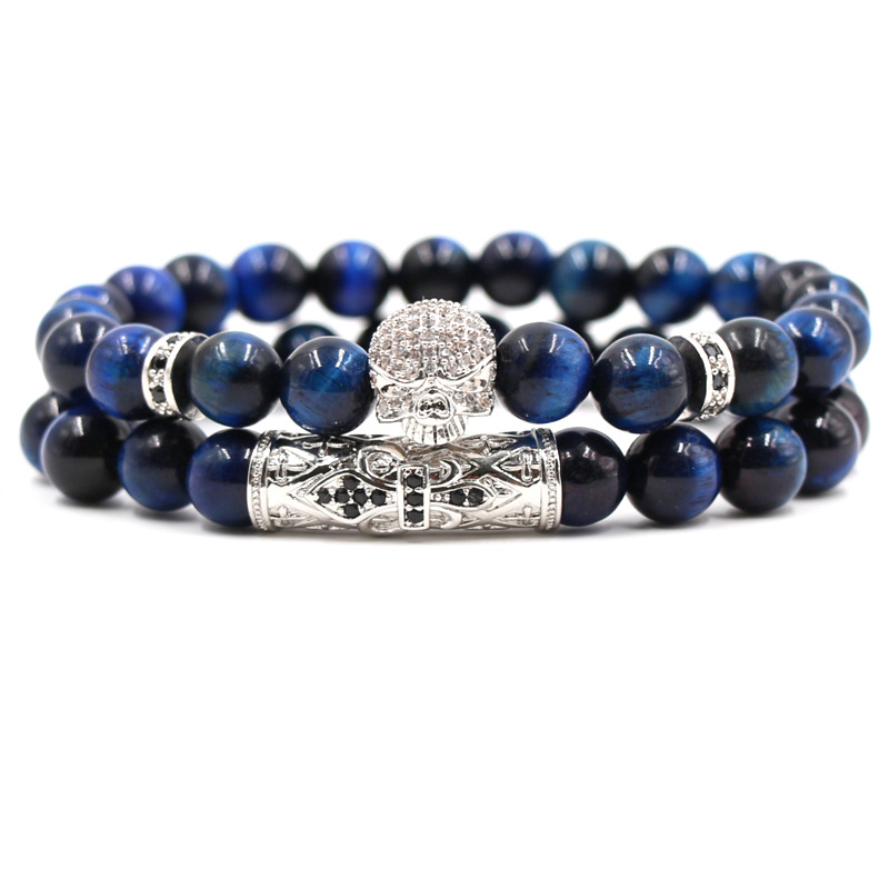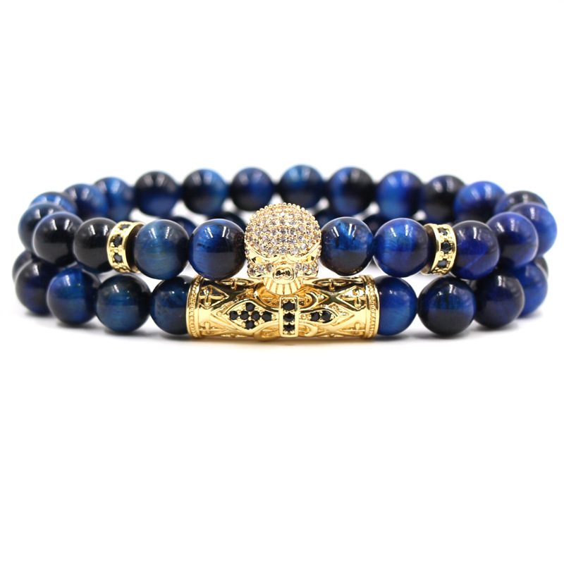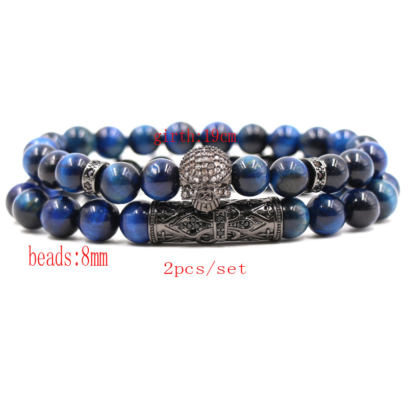 Popular Bracelet Micro Inset Zircon Curved Tube Skull Natural Blue Tiger Eye Stone Elastic Beads Bracelet Jewelry for Women Men