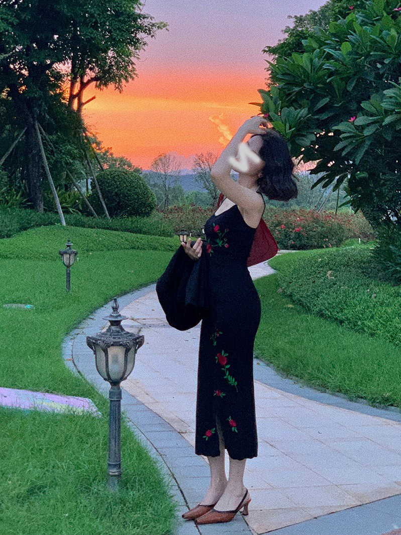 Color: black long-sleeved embroidered dress, black sleeveless suspender dress