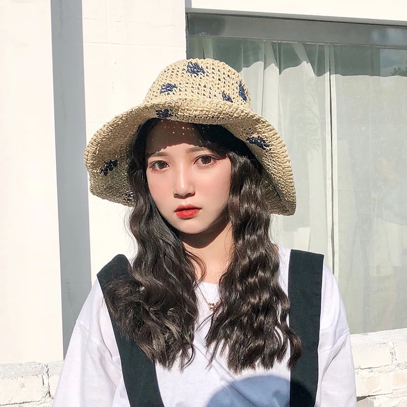 Product Details:Product Category: Bucket HatApplicable gender: femaleMaterial: StrawWeaving method: hand hookProcessing method: tie-dyePattern: DotColor: khaki, beigeSize: M (56-58cm)Eaves shape: flat eavesPackage Contents:Straw hat X1