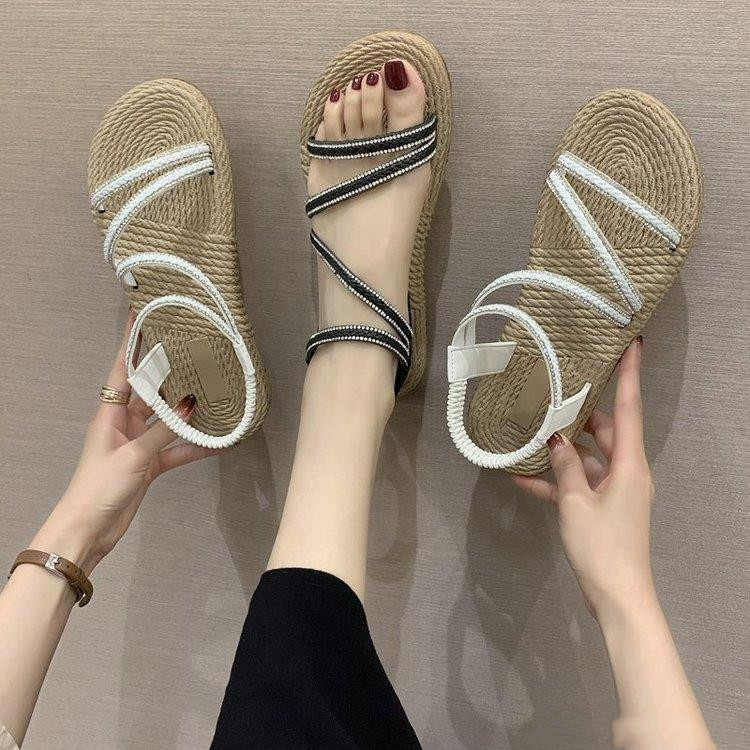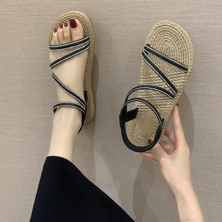 Upper Material: Artificial PUSole Material: Rubber Style: KoreanToe shape: fish mouthHeel height: low heel (1-3CM)Heel shape: Wedge heelPopular elements: rhinestones
