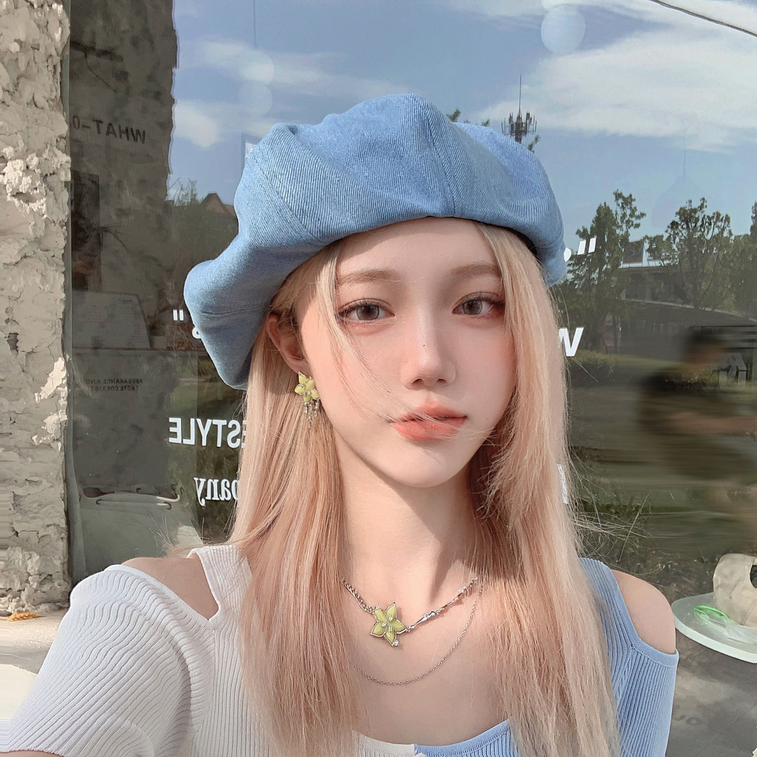 Color: sky blue beret, dark blue beret