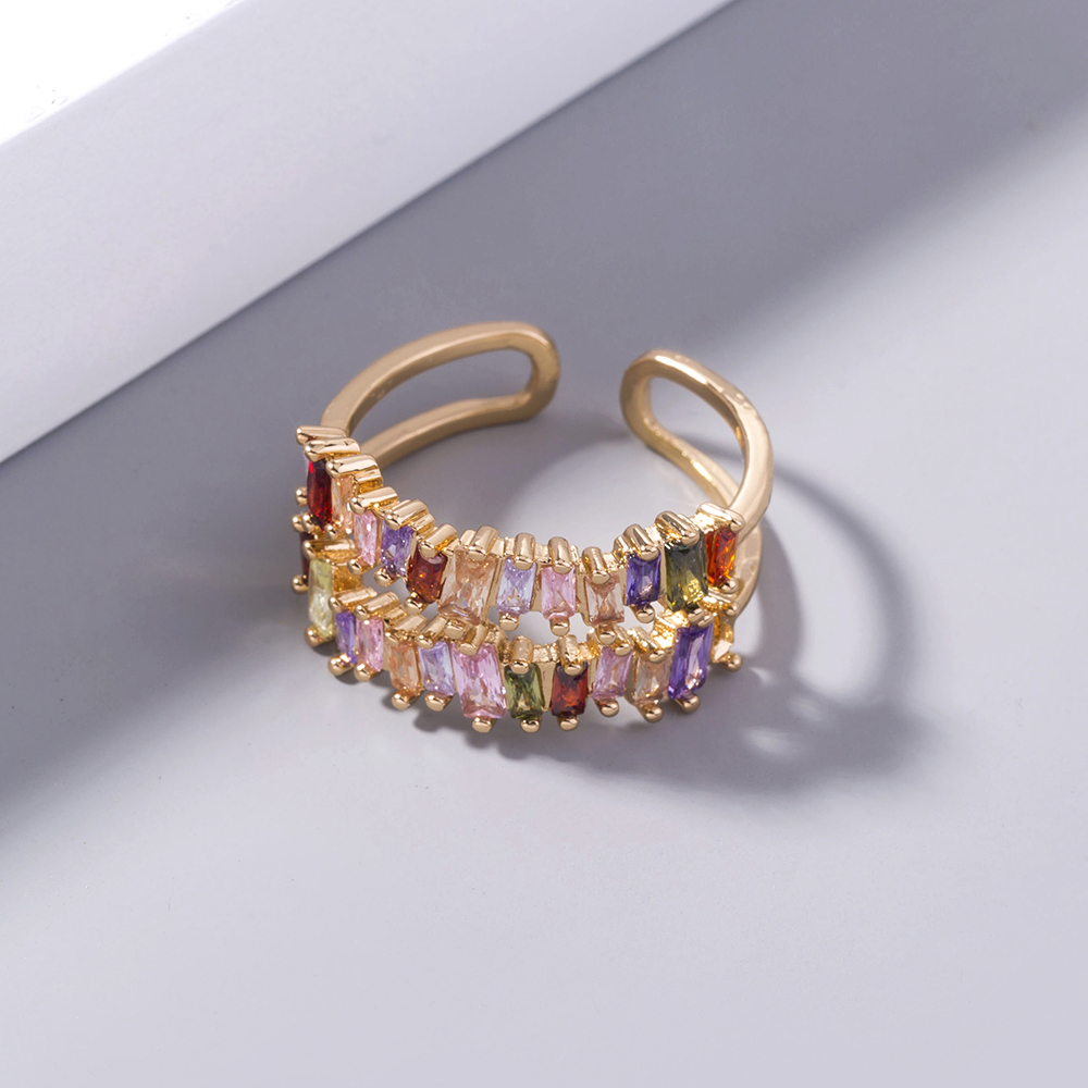 European and American jewelry Ins net red irregular square double row color zircon ring fashion rainbow gem ring female