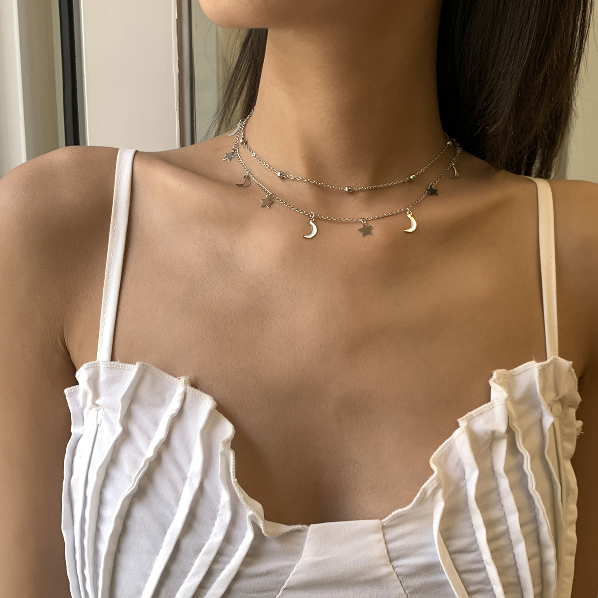 Product Information:material: metal Modeling: GeometryChain style: round bead chainExtension chain: 10cm or lessCircumference: 21cm (inclusive)-50cm (inclusive)Color: golden silverPacking list:Clavicle chain* 1