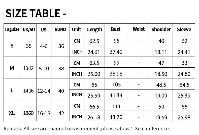 1. Asian sizes are 1 to 2 sizes smaller than European and American people. Choose the larger size if your size between two sizes. Please allow 2-3cm differences due to manual measurement. 2. Please check the size chart carefully before you buy the item, if you don't know how to choose size, please contact our customer service. 3.As you know, the different computers display colors differently, the color of the actual item may vary slightly from the following images.