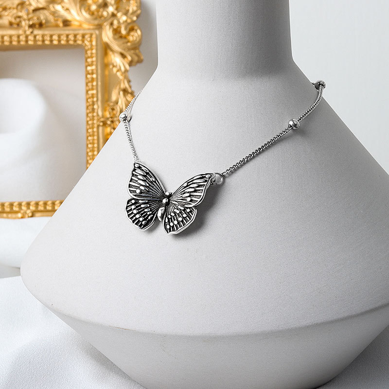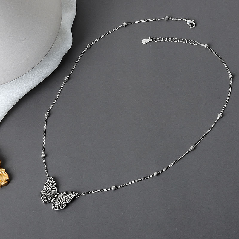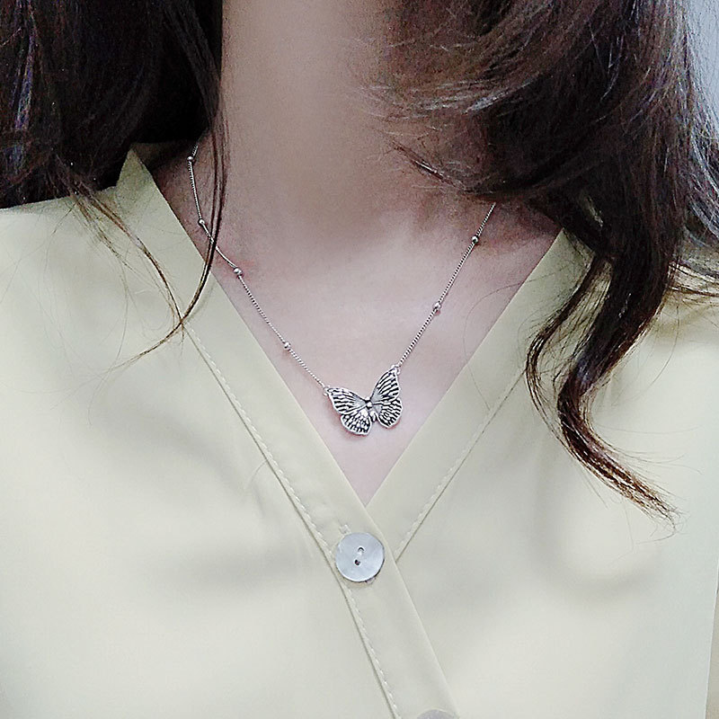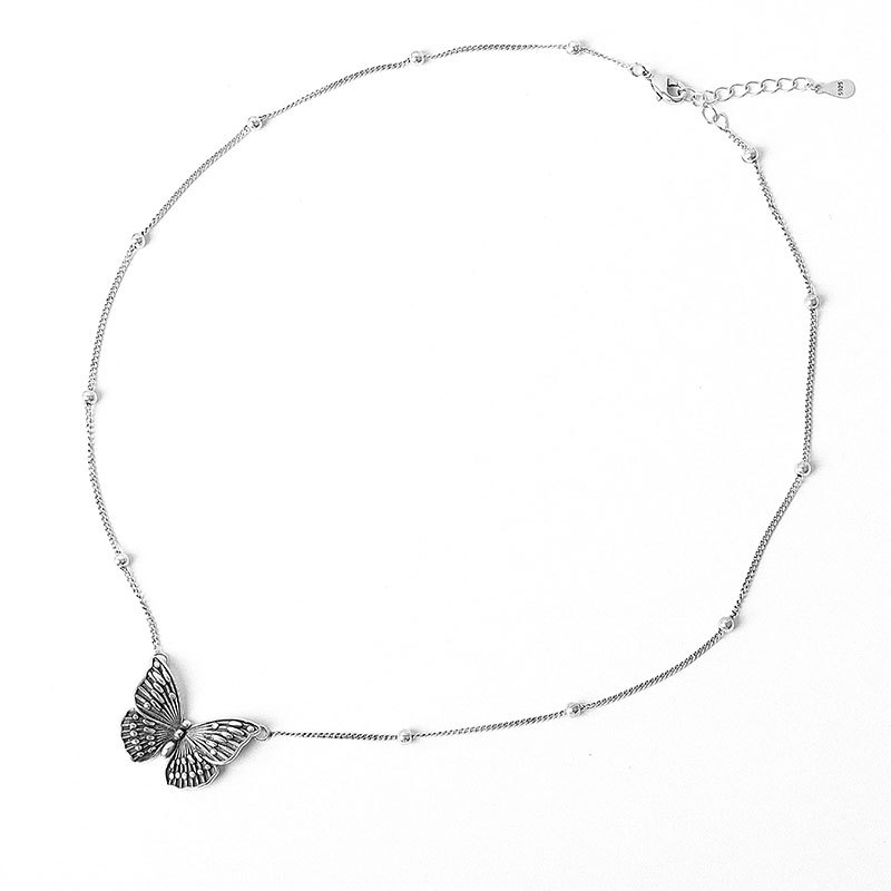 Vintage Thai Silver Round Bead Butterfly Necklace Female Ins Fashion Net Red Clavicle Chain