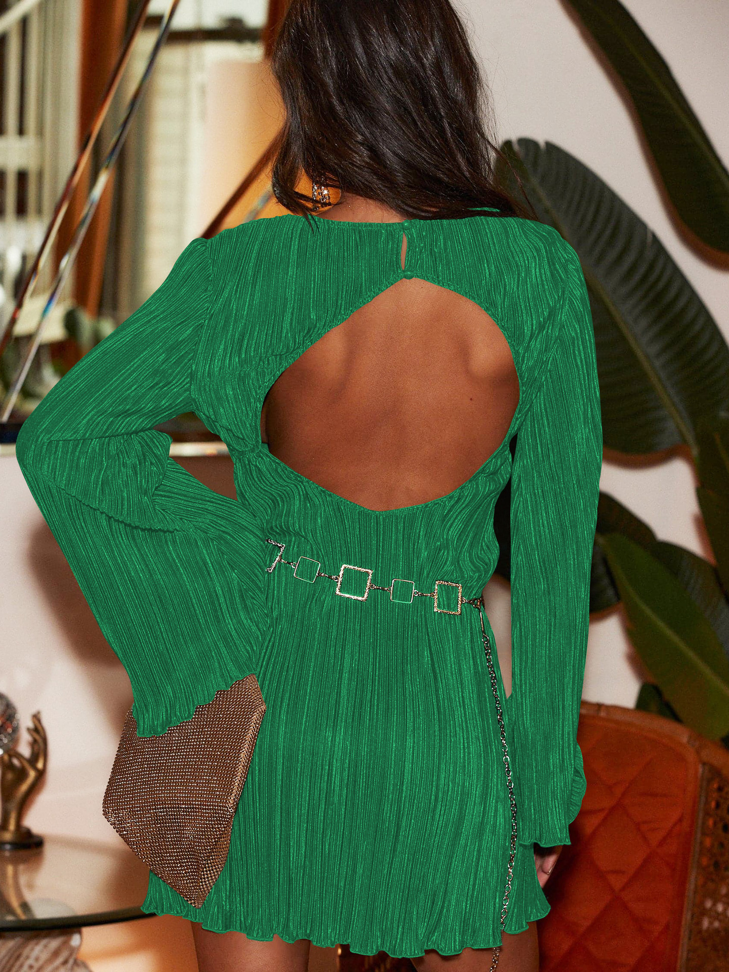 Hollow Dress Long Sleeves, Pure Color Skirt Temperament Sexy Flash Evening Dress