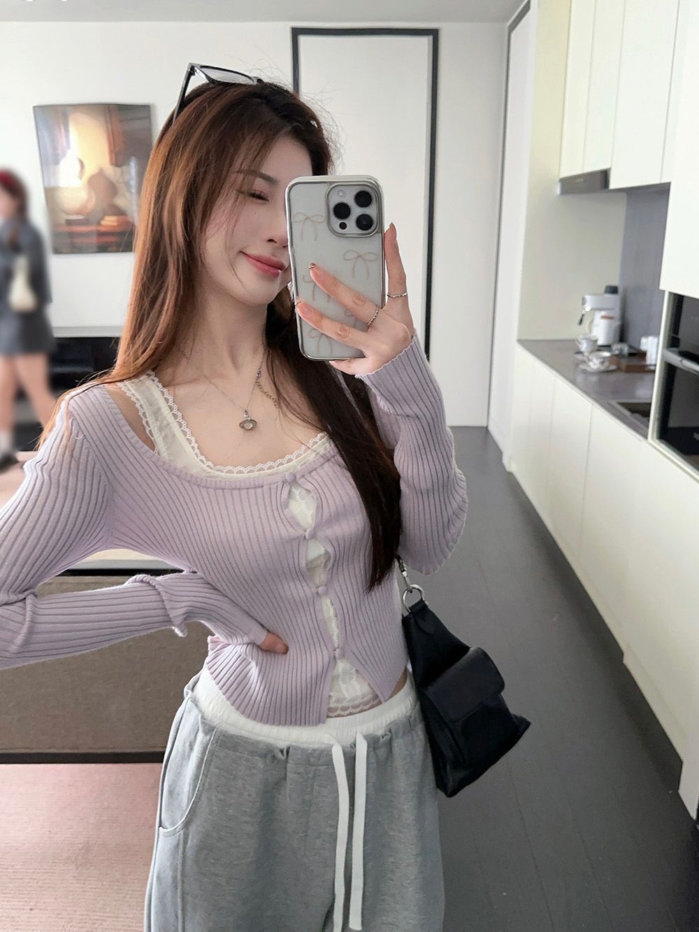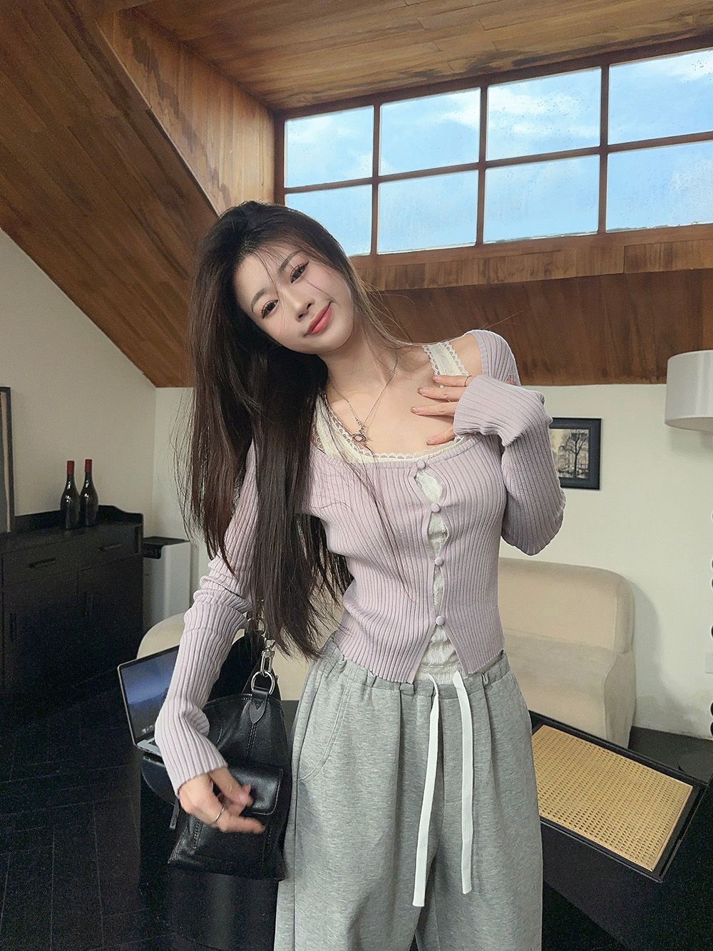 Lace Edge Niche Square Collar Collarbone Slimming Top