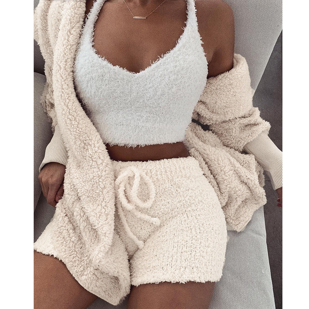 Adogirl Women Fleece Plush Casual Two Piece Set Long Sleeve Hooded Cardigan Coat Autumn Winter Outwear Shorts Fashion Outfits