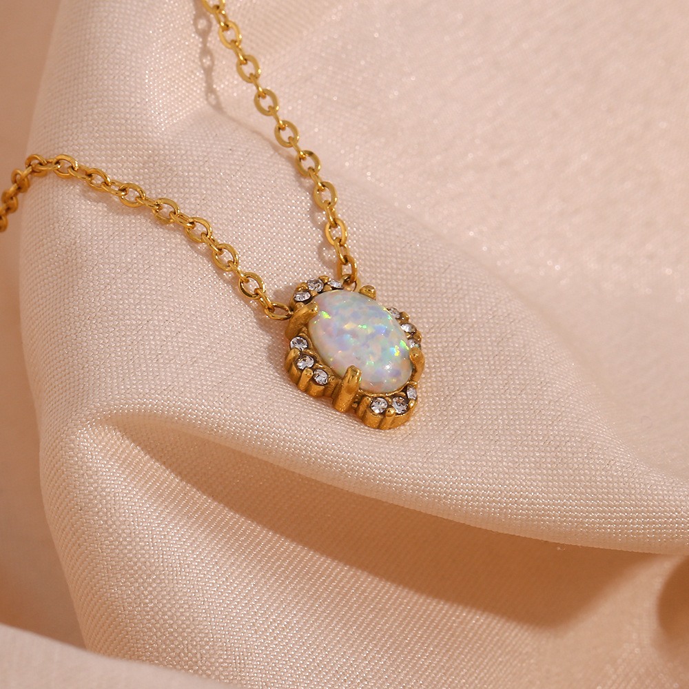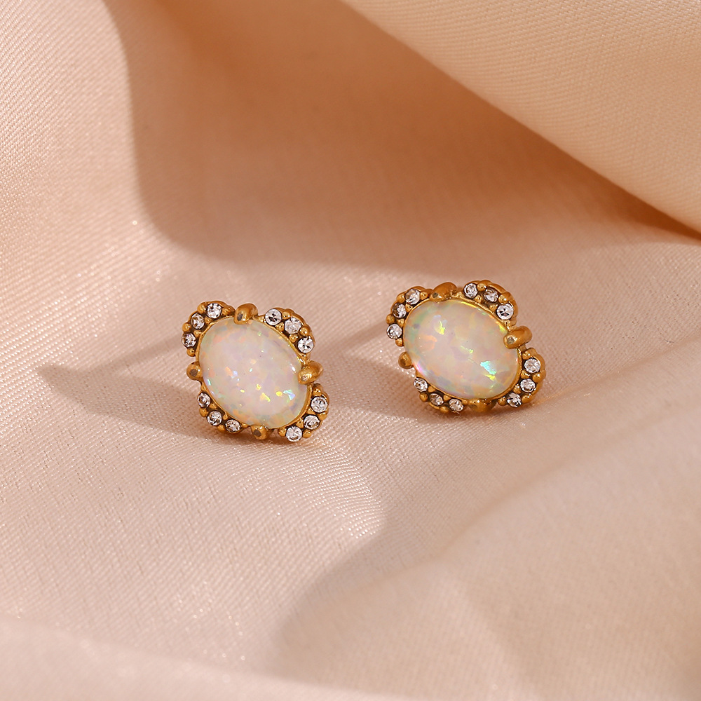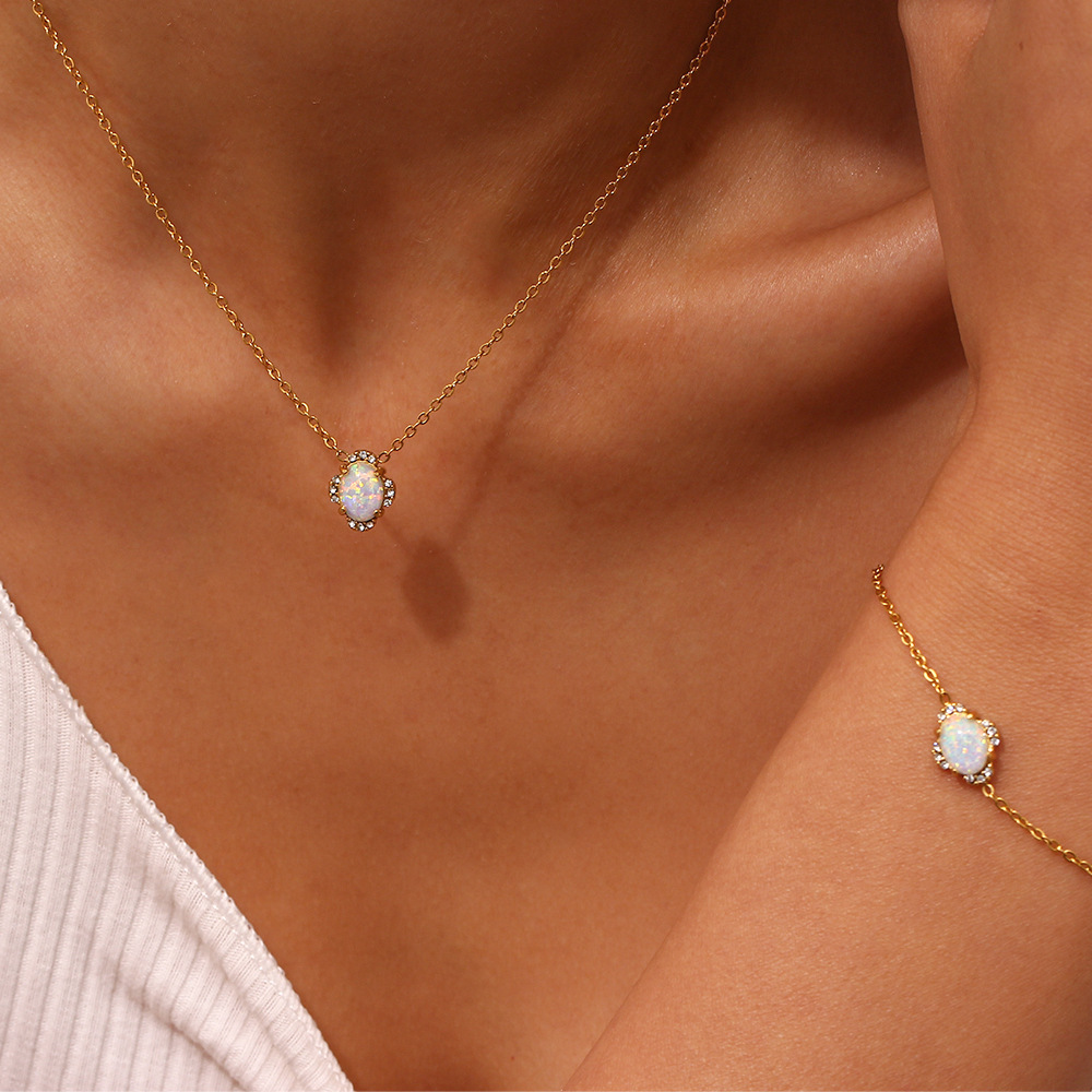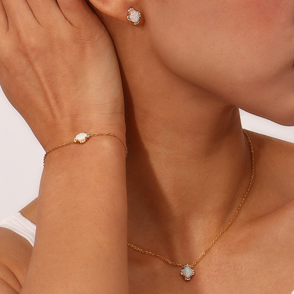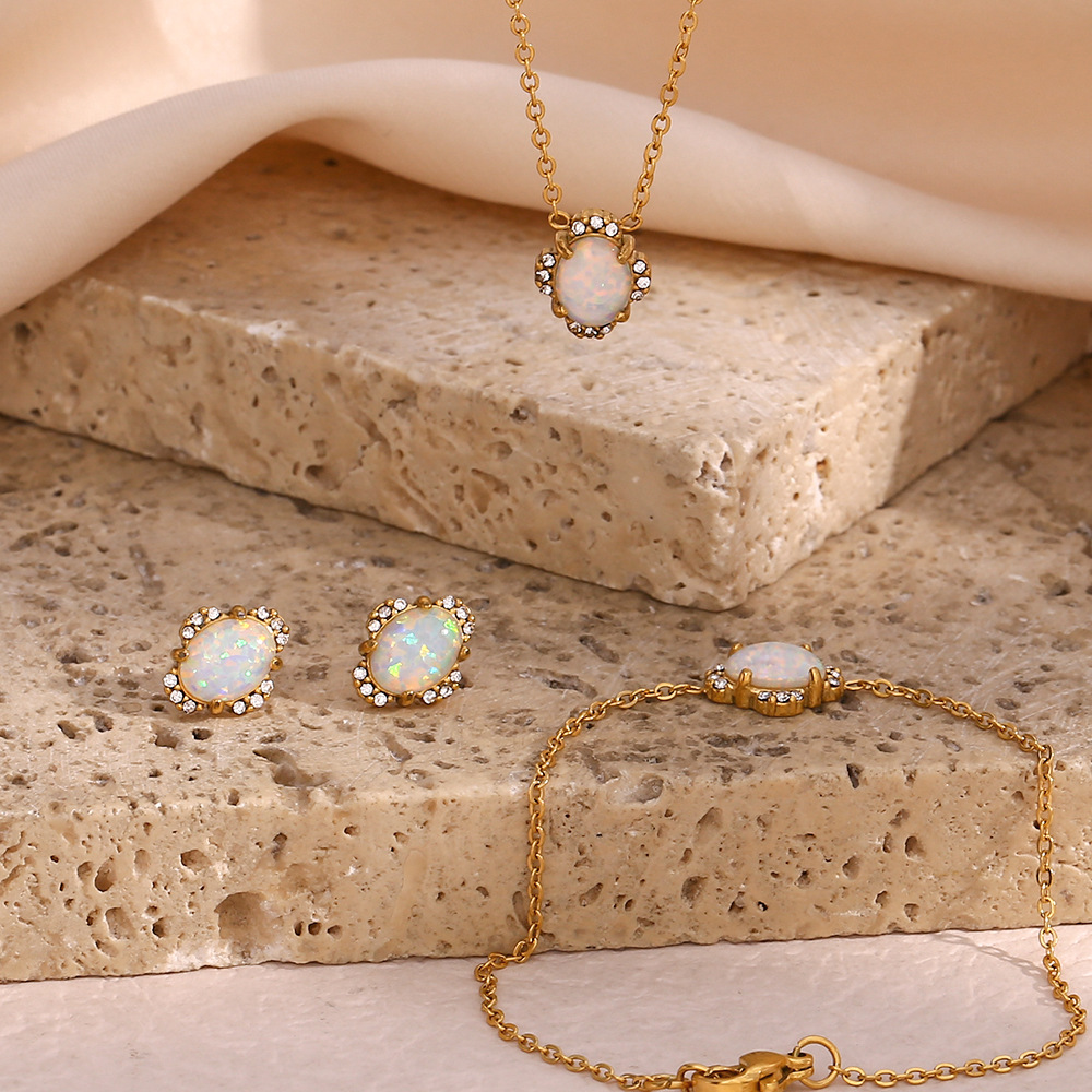 Color: vintage Oval petal opal necklace-Gold White, vintage Oval petal Opal stud earrings-Gold White, vintage Oval petal opal bracelet-Gold White