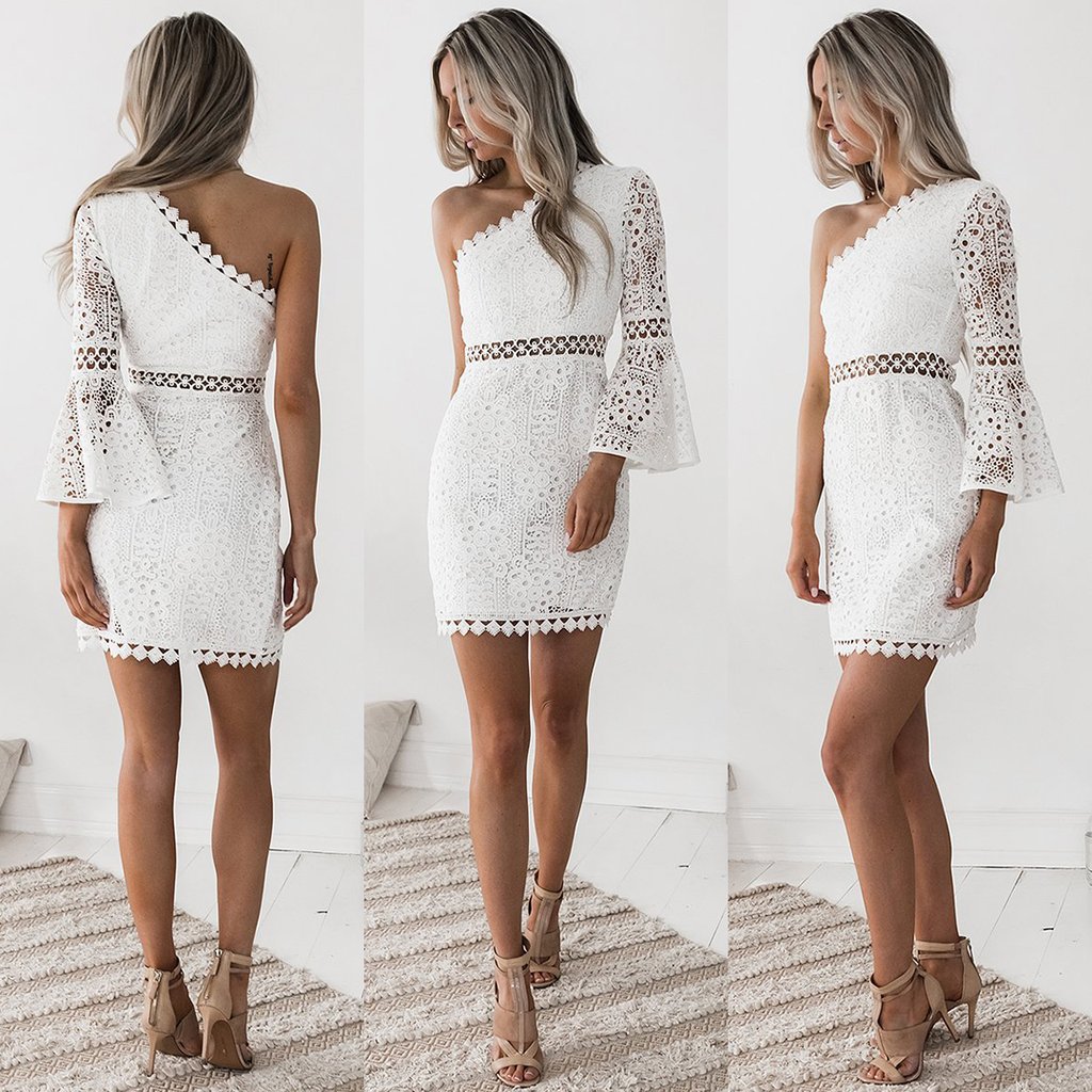 Sexy slanted shoulder lace stitching openwork long sleeve dress