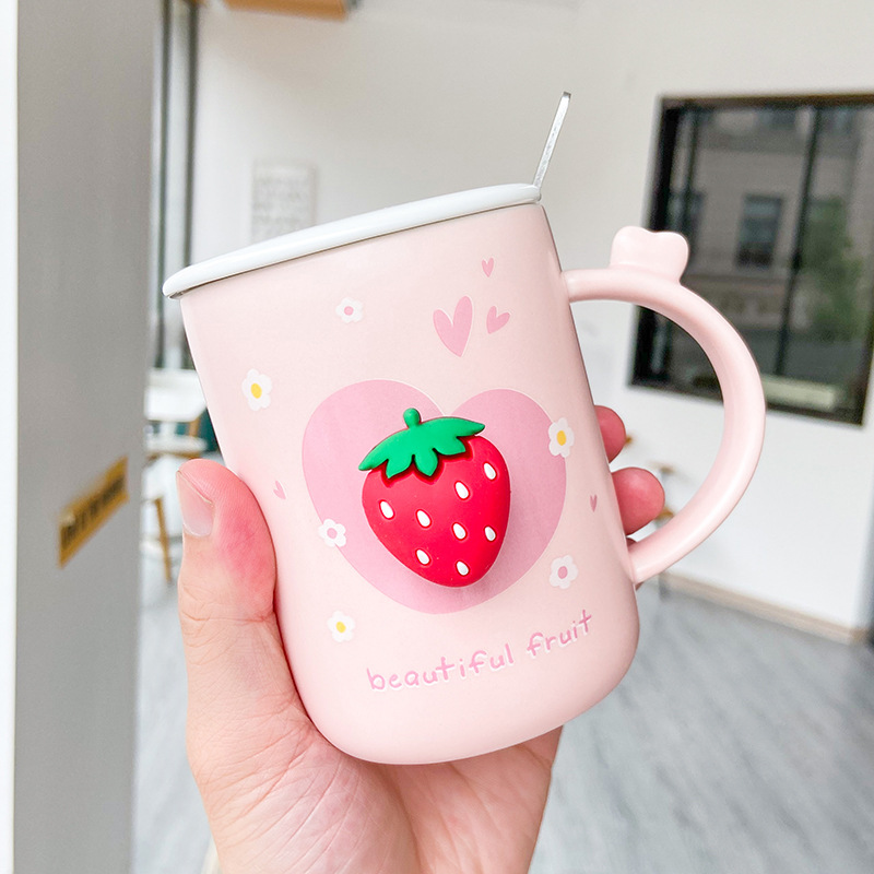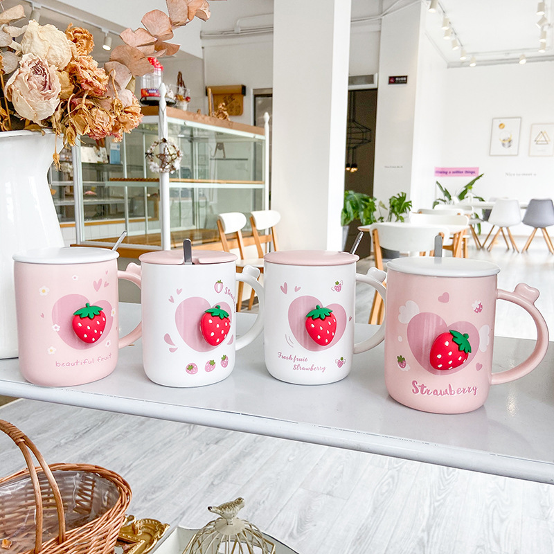 Color: three strawberries at the bottom of a white cup, two rows of letters at the bottom of a white cup, white flowers in a white cup