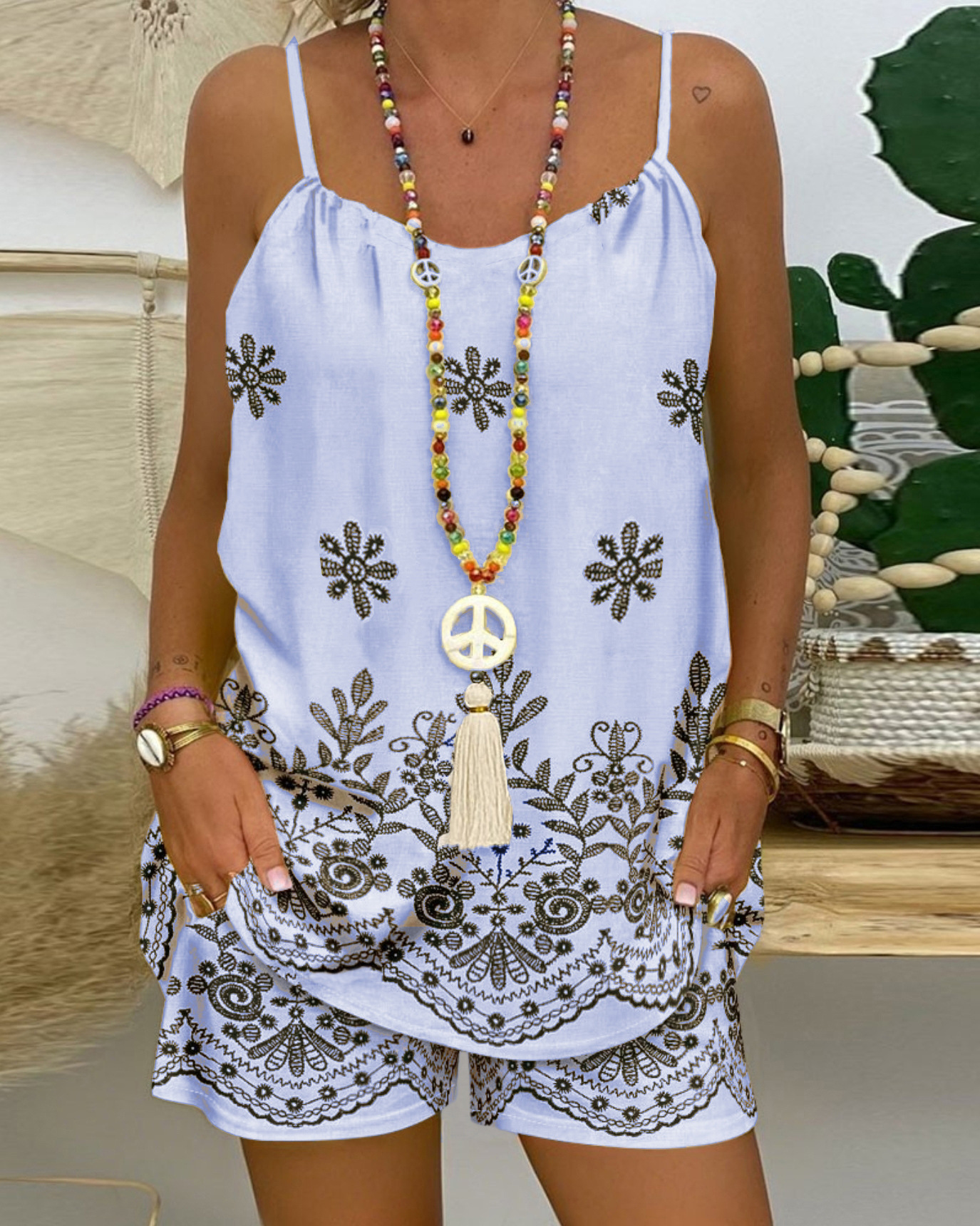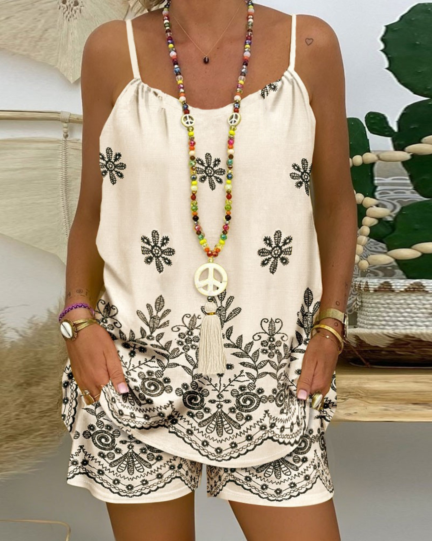 Vest And Floral Print Pocket Design Shorts Suit
