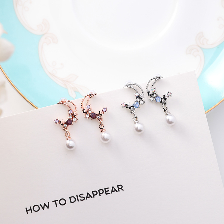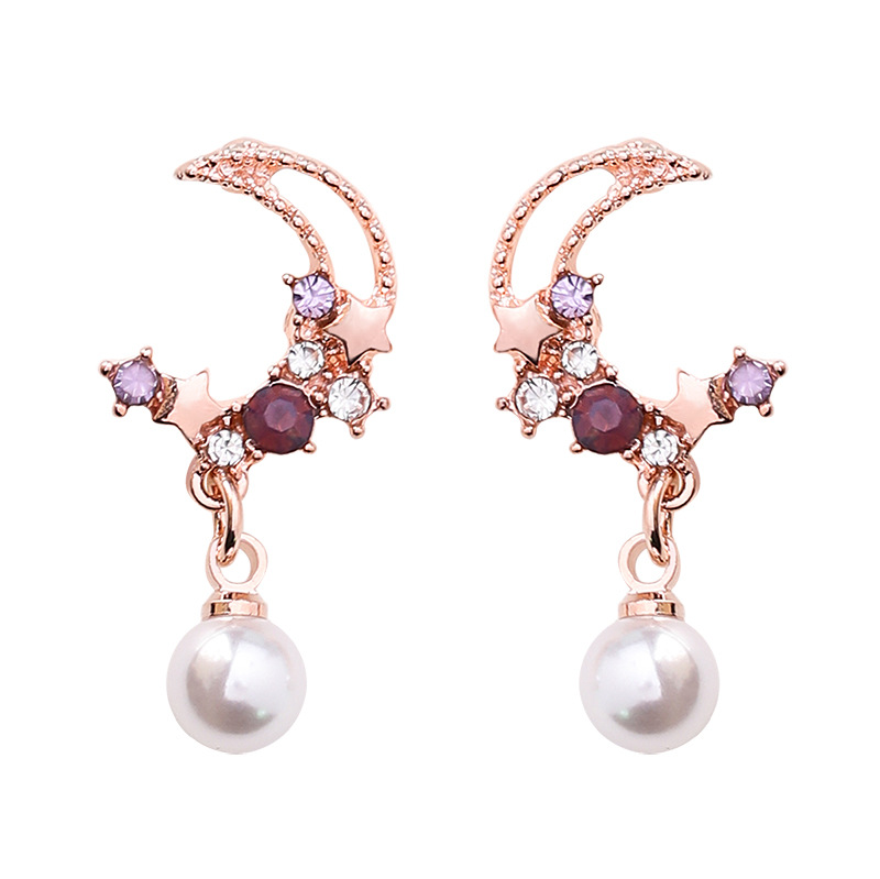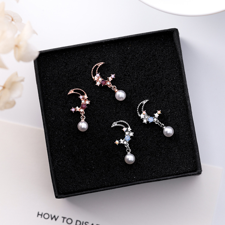 925 silver needle Korean version of the diamond star moon pearl pendant earrings sweet fashion rhinestone crescent earrings earrings