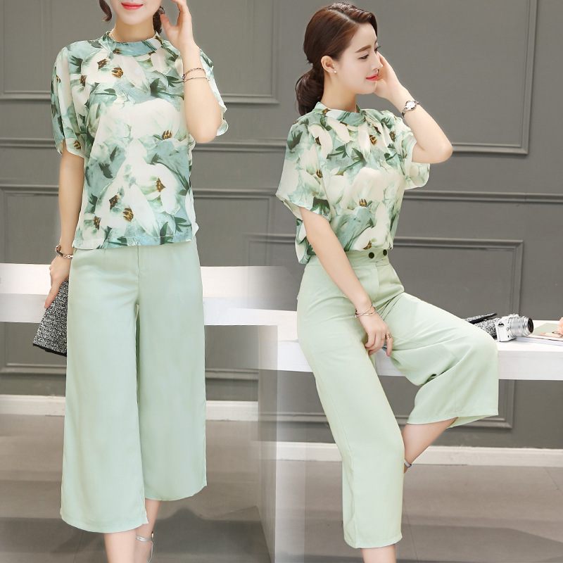 Summer wear, two piece trousers, Korean version, chiffon short sleeved blouse, wide leg pants, casual fashion suit girl.