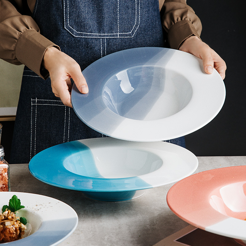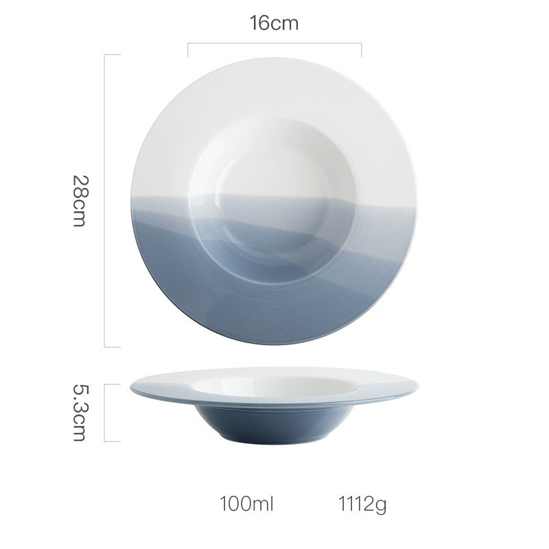 Material: ceramicPattern: color contrastShape: roundSurface technology: underglaze colorColor: pink, grey, blueSize: 11 inches, 9 inches