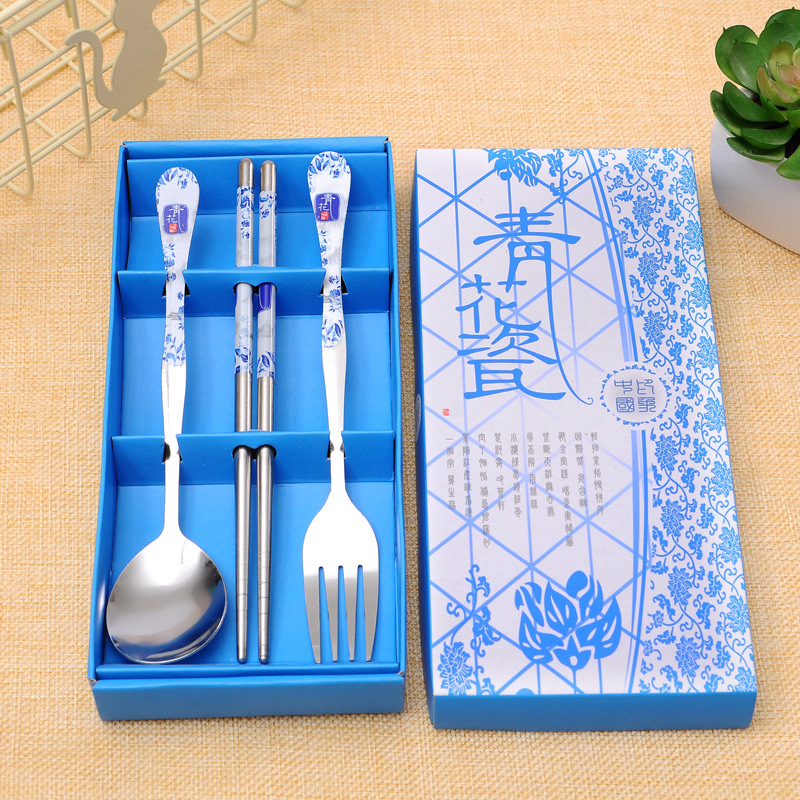 Material: Stainless steelNumber of kits: three-pieceProduct size: Fork length: 18. 5cm, spoon head width: 4cm, chopstick length: 18. 5cmPacking box: 21*10*3cm
