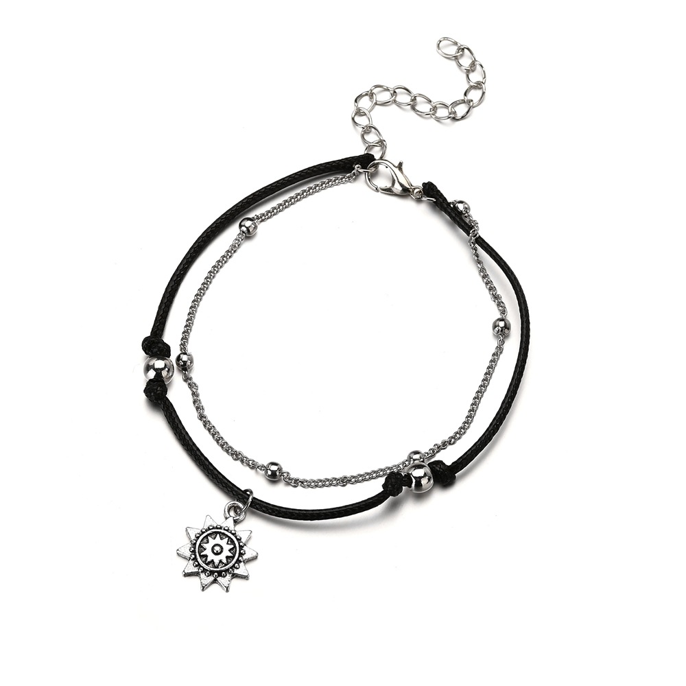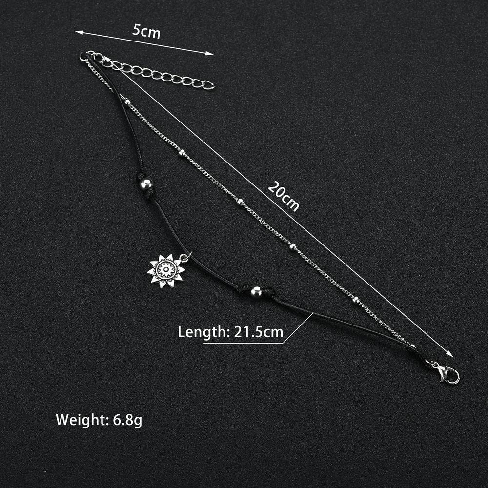 Bohemian double vintage silver sun pendant ankle bracelet with retro beads