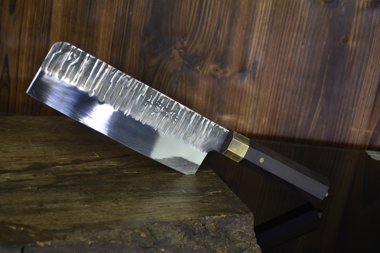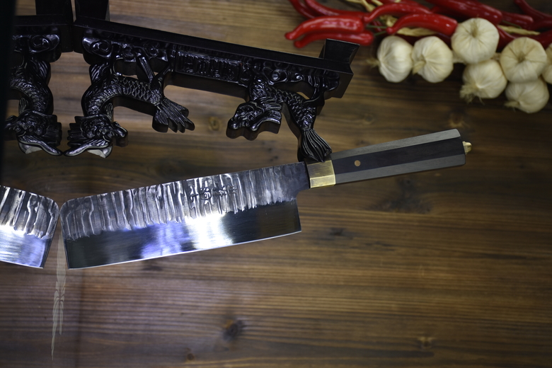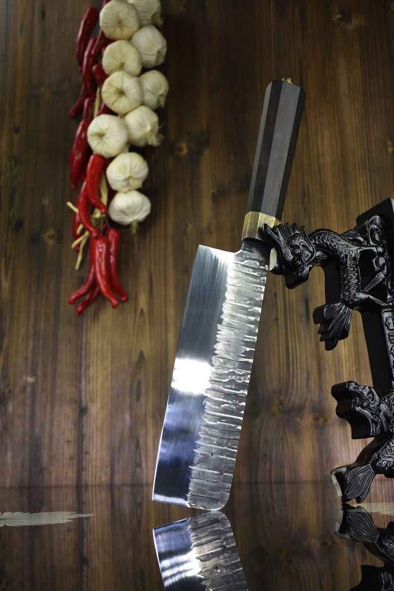 Full length: 33cm Blade length: 20cmHandle length: 13cm Blade width: 5.9cmThickness: 0.25cm Blade material: 5Cr15MOV (5 chromium 15 molybdenum vanadium steel)Handle material: ebony net weight: 0.3kg
