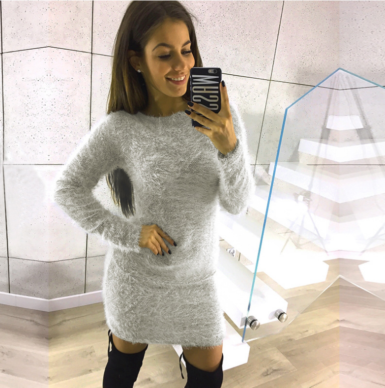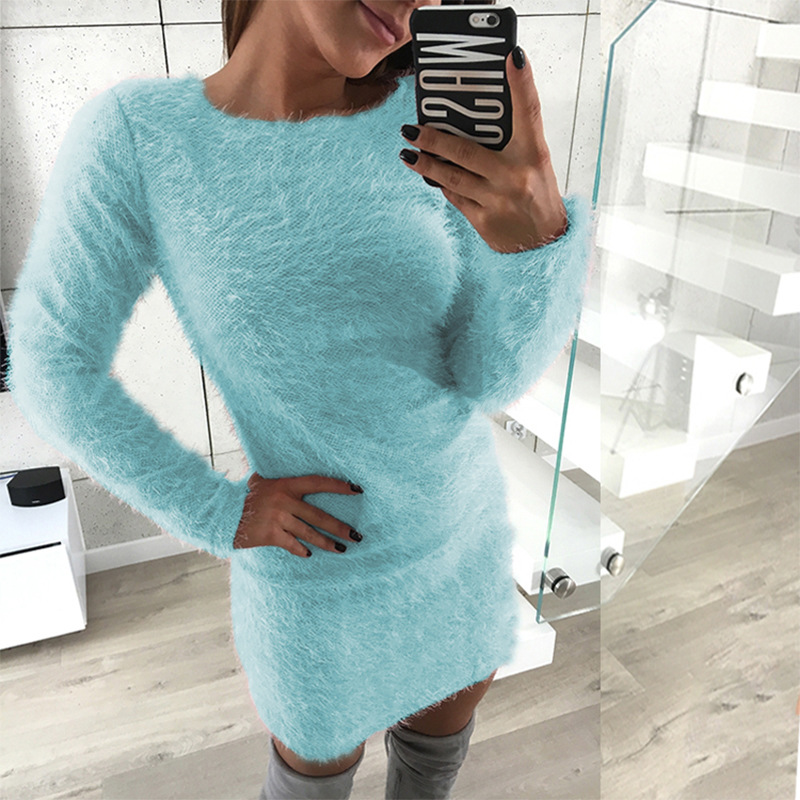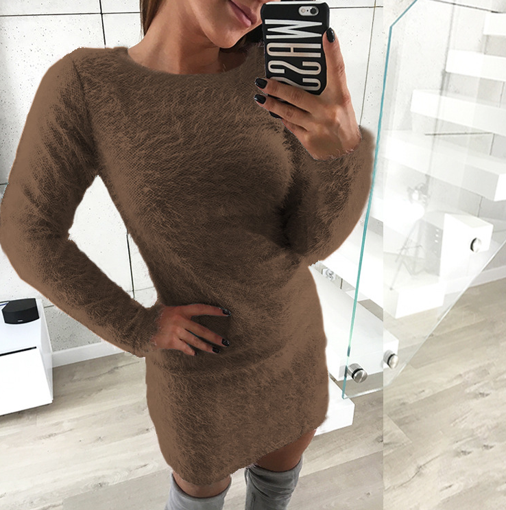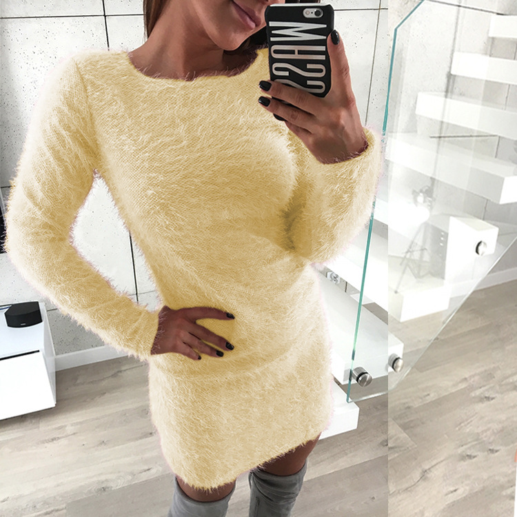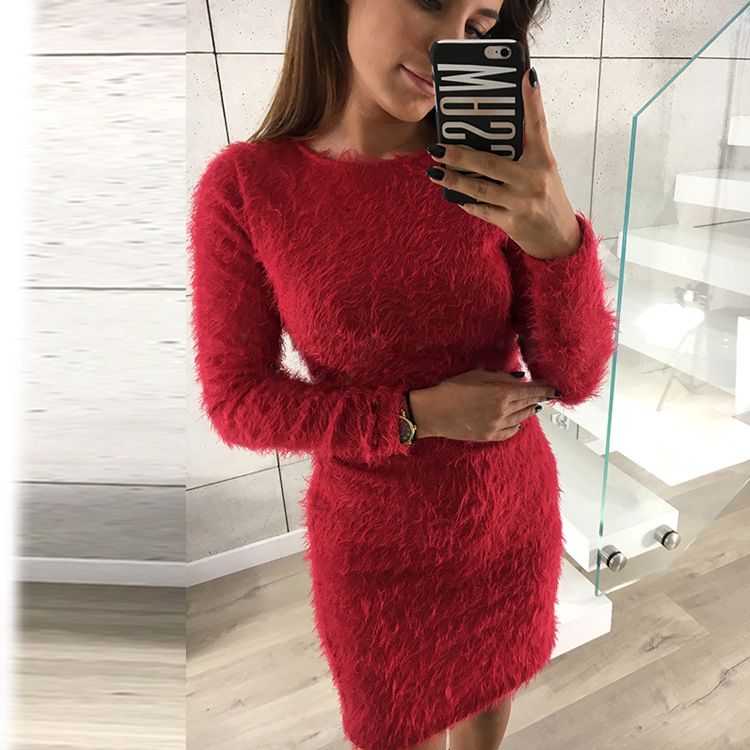 Long sleeve round neck plush mid-length dress