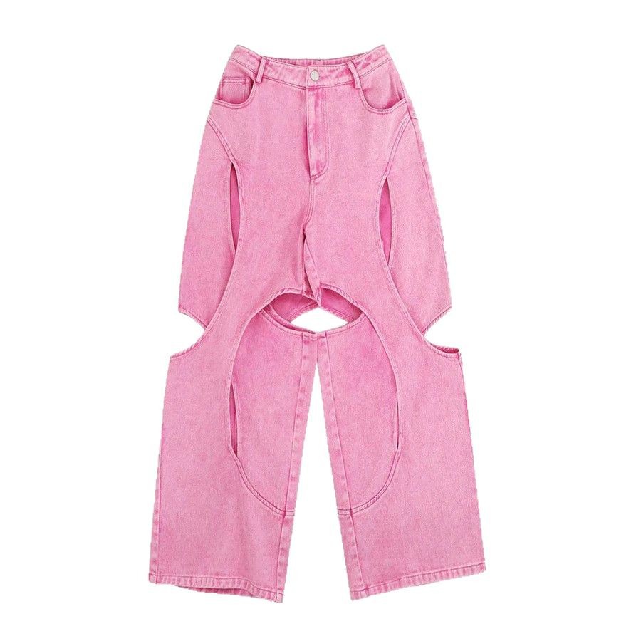 Product information: Color: Pink Size: S,M,L Style type: Street hipster Popular elements: see-through Style: straight-leg pants Fabric name: Polyester Pants type: loose type Style: Denim style Craft: Hollow