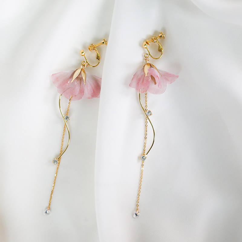 Product information:Material: Mixed Color classification: S-shaped peach blossom ear hook pairs, S-shaped peach blossom ear clip pair Size: The total length is about 11cm (including ear hook or ear clip)