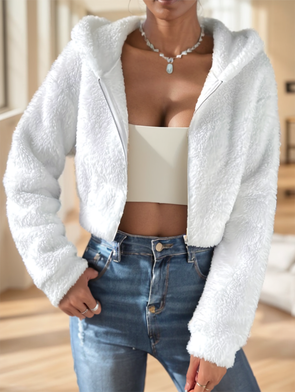 Solid Color Zip-up Teddy Hoodie, Casual Long Sleeve Hoodie Jacket