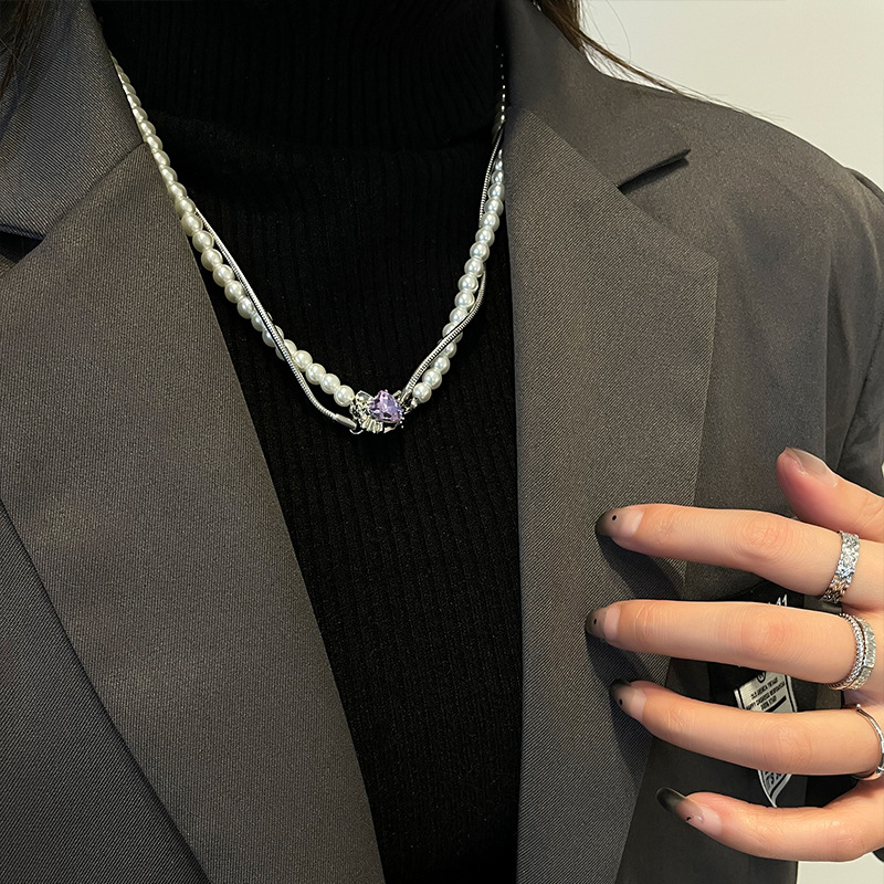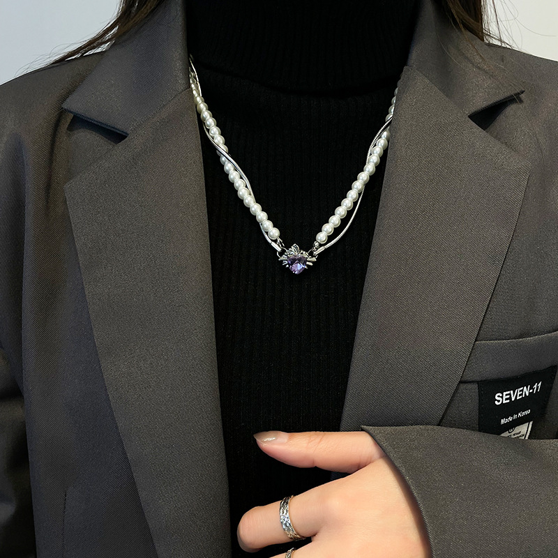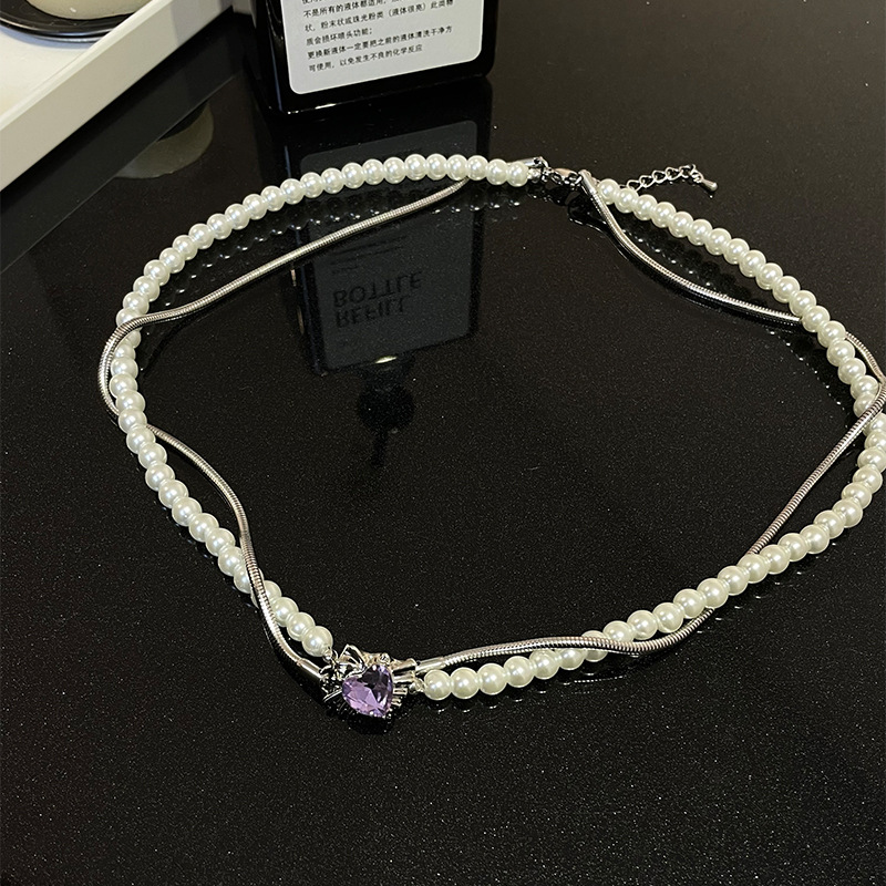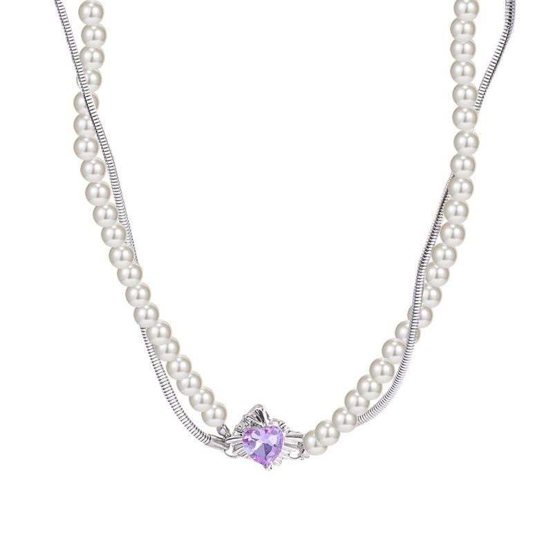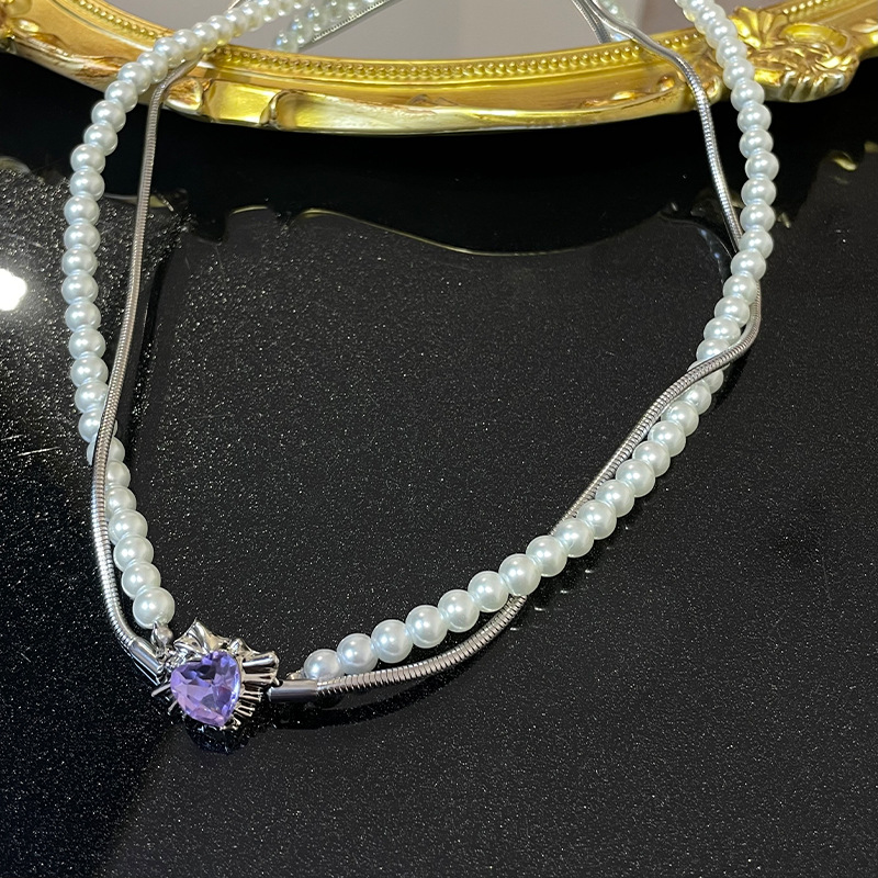 Product information:Color: purple diamond love pearl necklacePendant material: AlloyStyle: Women'sChain style: snake bones chainMaterial: titanium steelShape: heart shapePopular elements: PearlStyle: sweet and cool