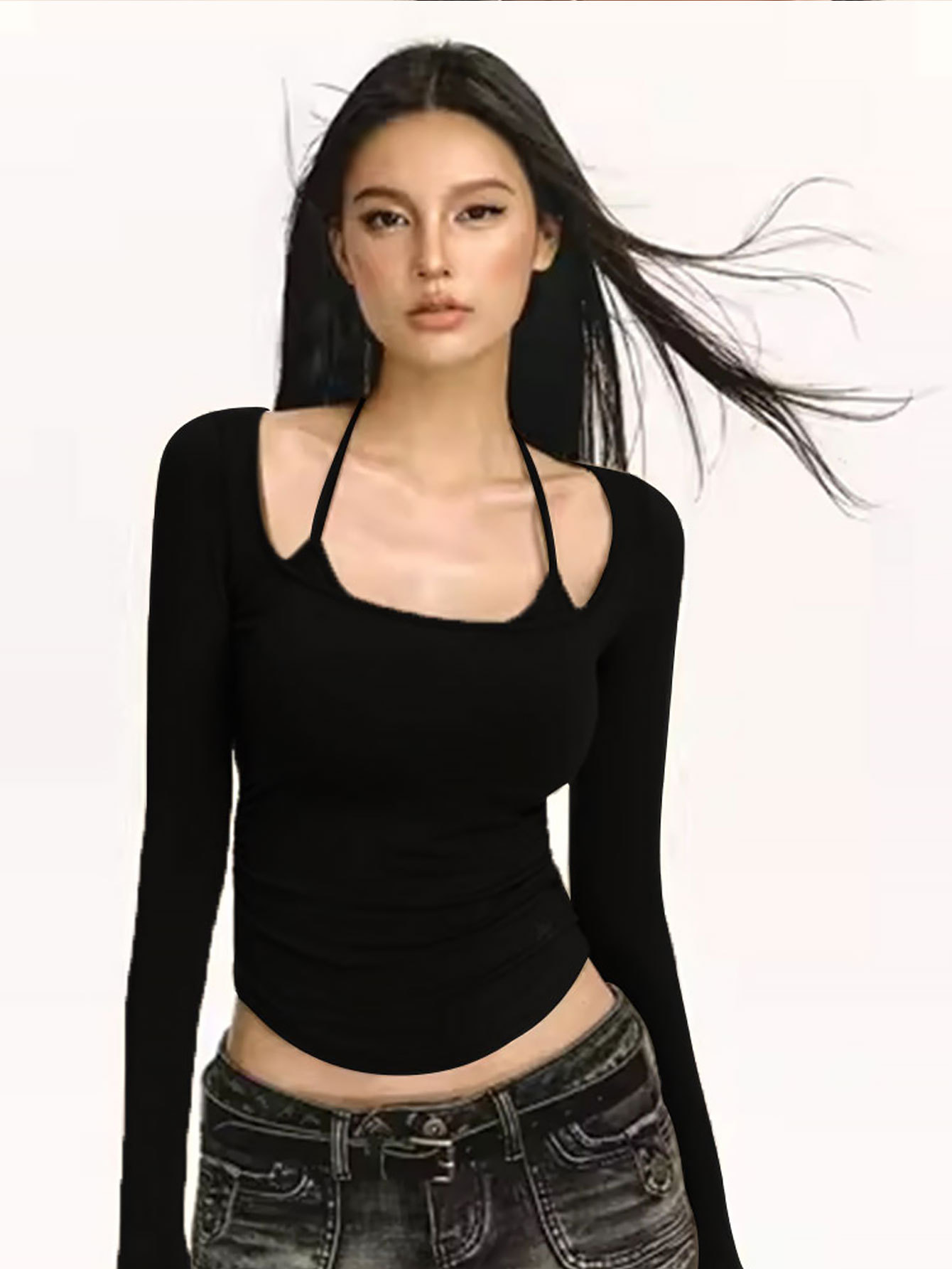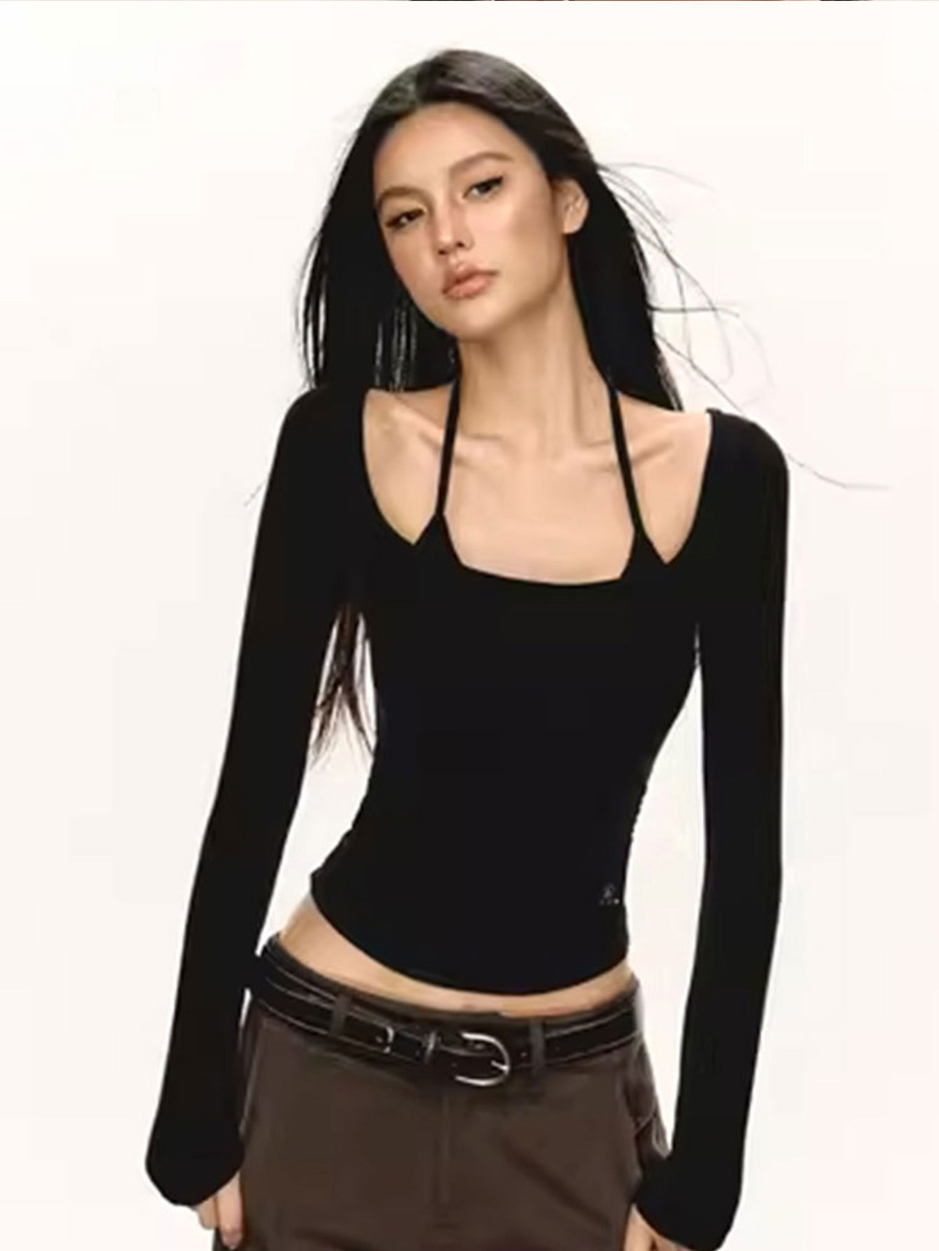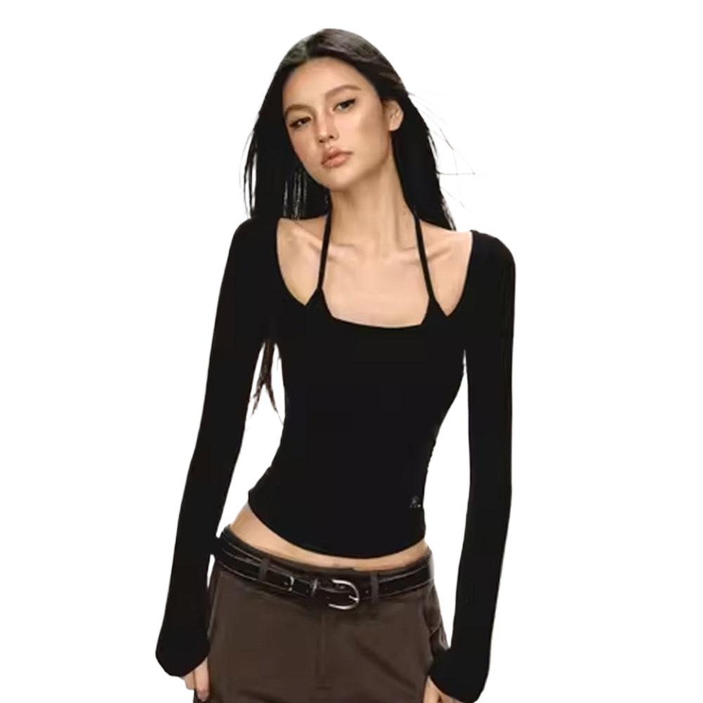 Product information: Fabric name: viscose fiber Color: Black Main fabric composition: viscose fiber Size: S,M,L,XL Style type: Street hipster Sleeve length: long sleeve Popular elements: slim fit Style: Halter Style: Trendy