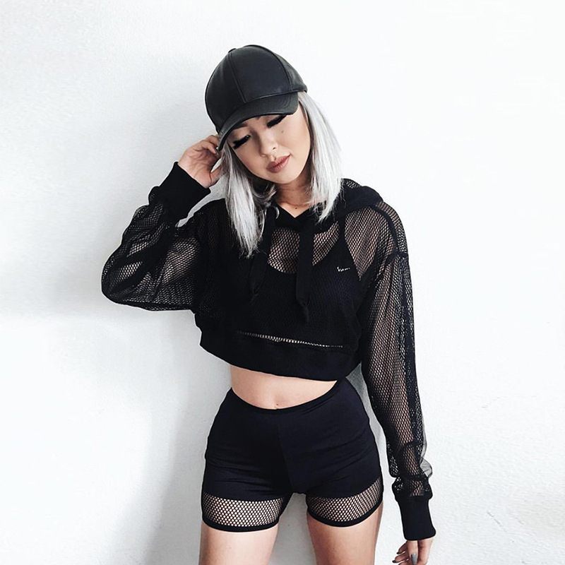 Mesh long-sleeved hooded blouse casual perspective top