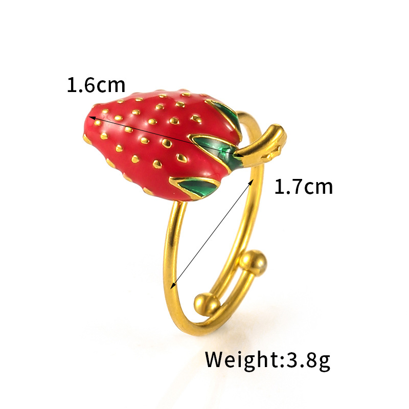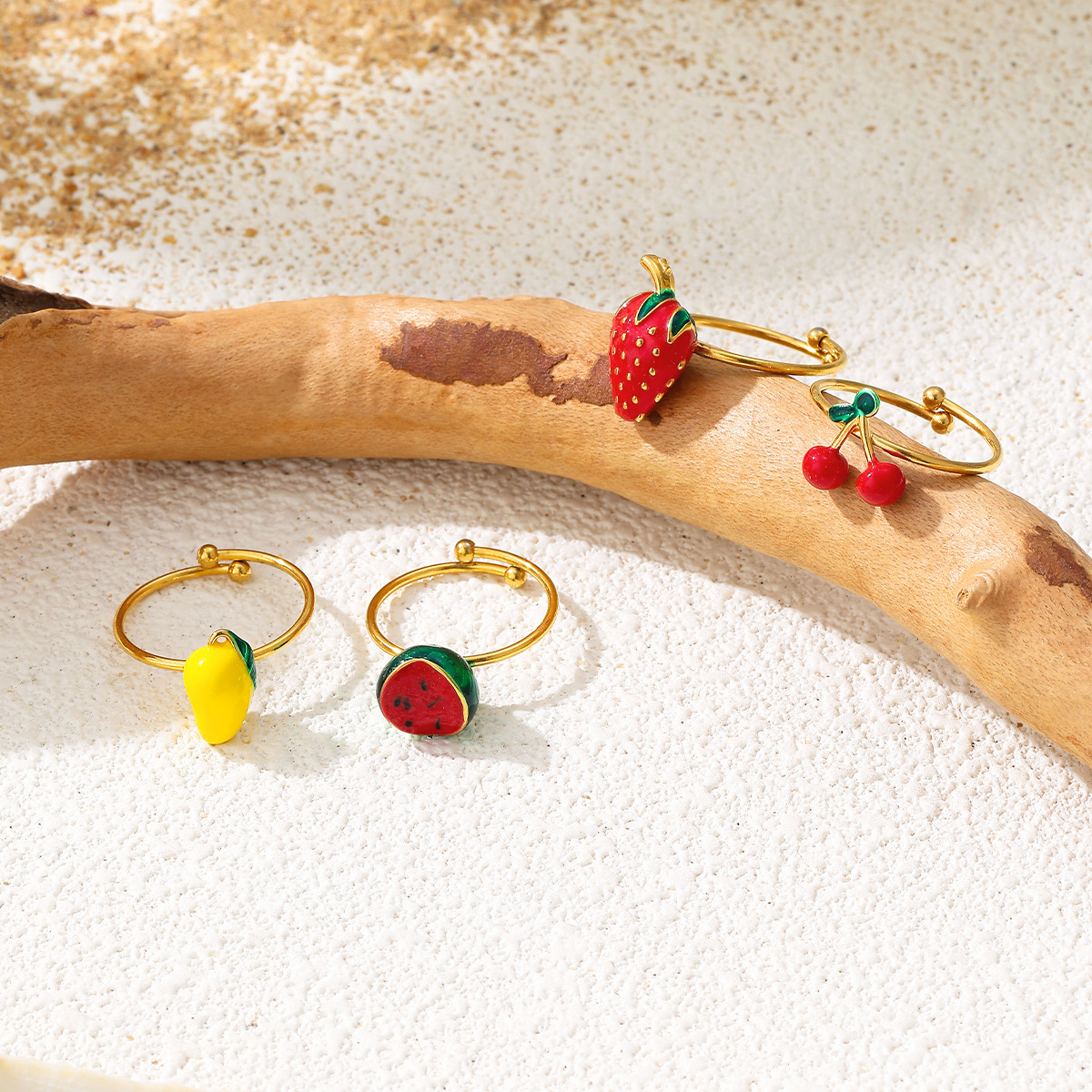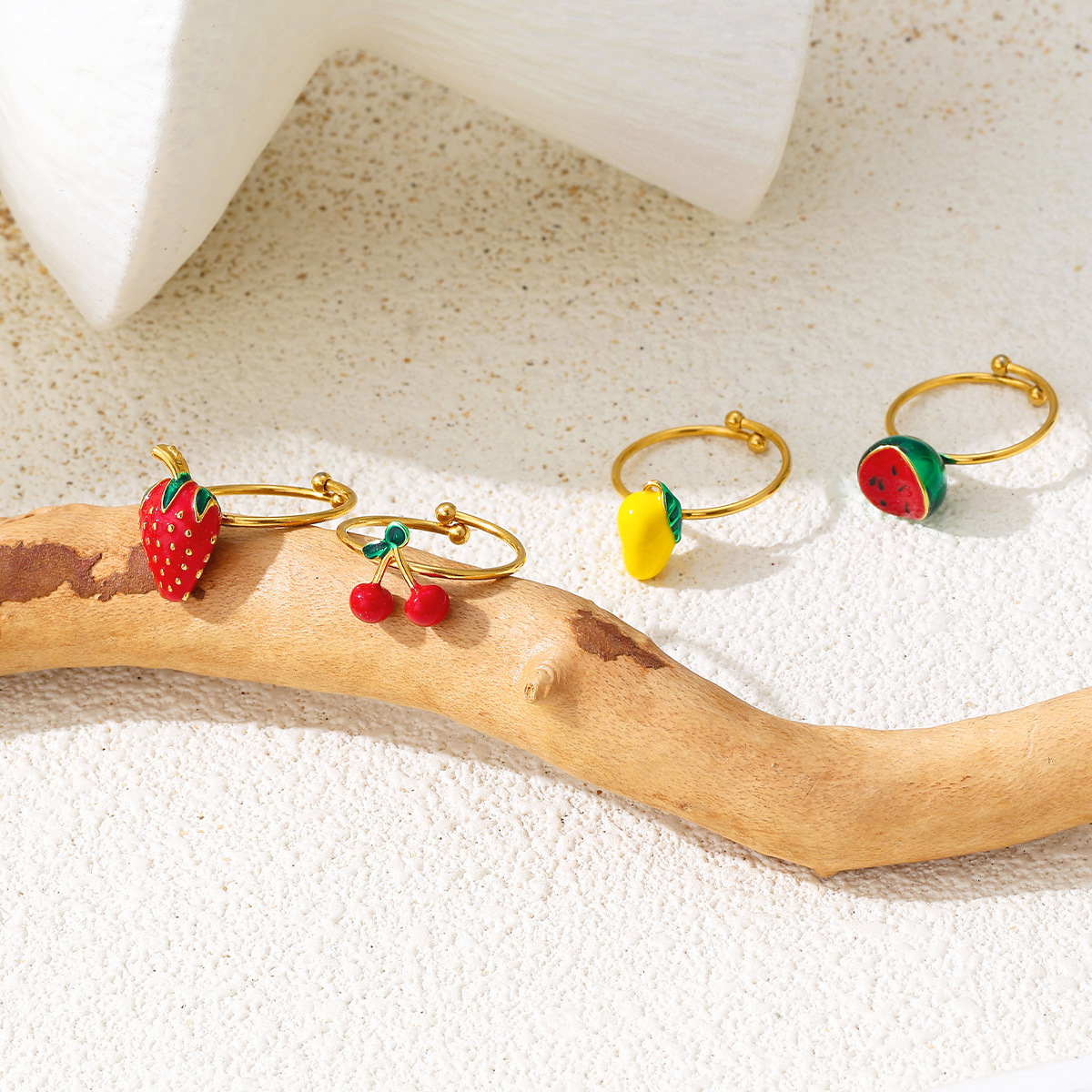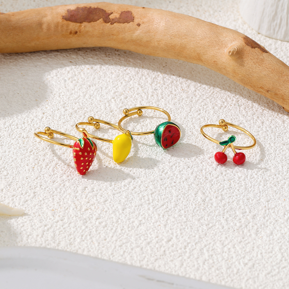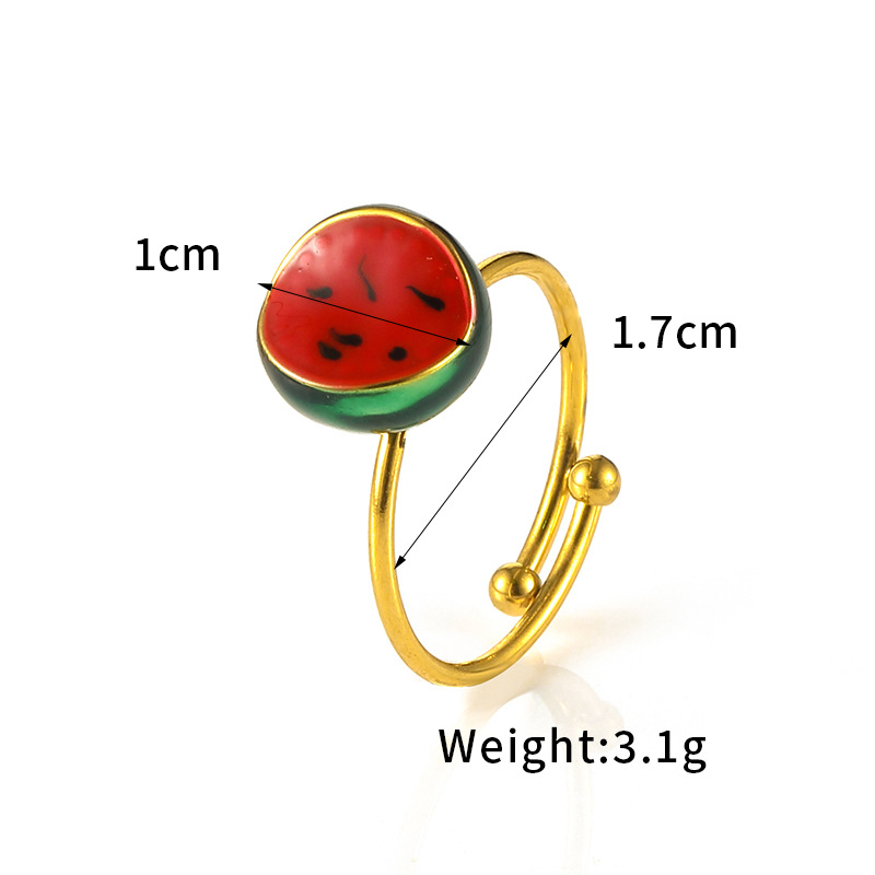 Product information:Pattern: fruit Type: Ring Treatment Process: dripping oil Color: cherry, strawberry, watermelon, Mango Material: Stainless steel Size: Medium Style: Niche