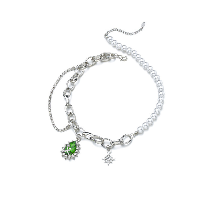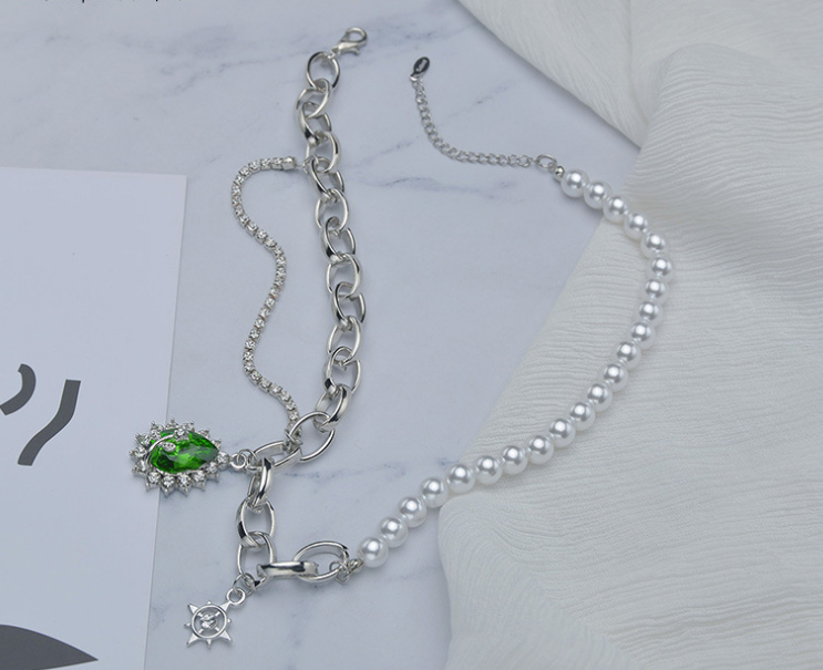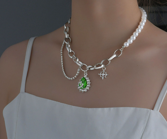 Stitching Pearl Necklace Elegant Temperament INS Wind Inlaid Green Zirconium