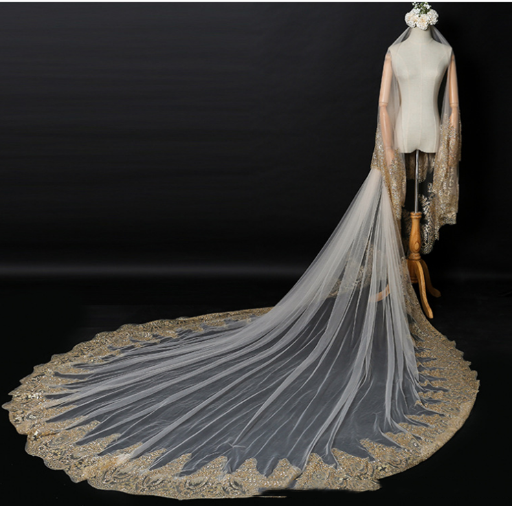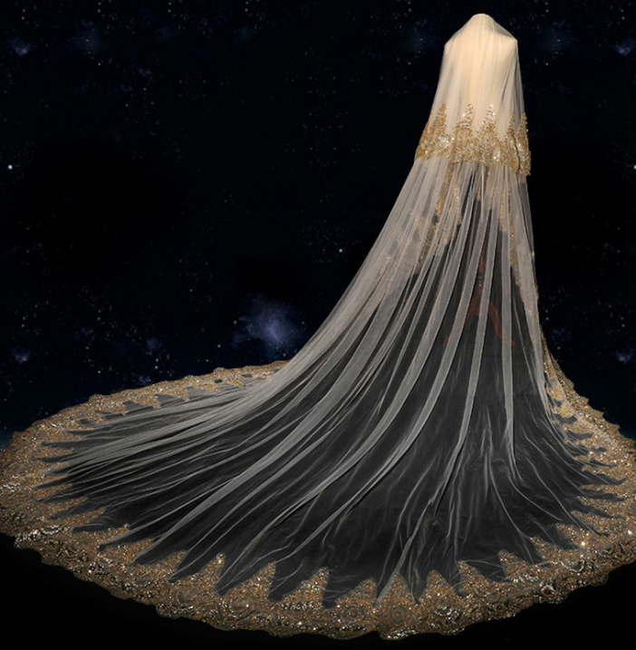 New Bridal Sequins Extra Long Lace Veil With Diamonds