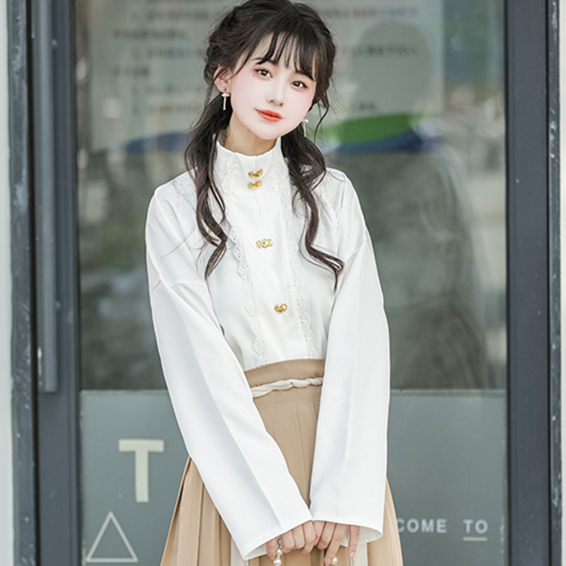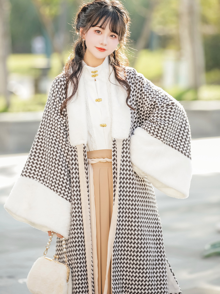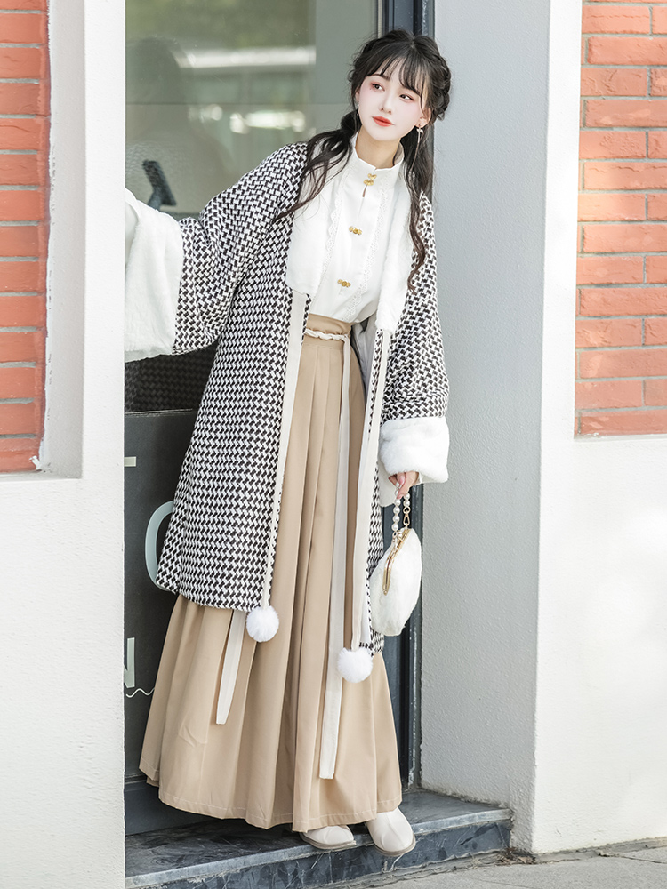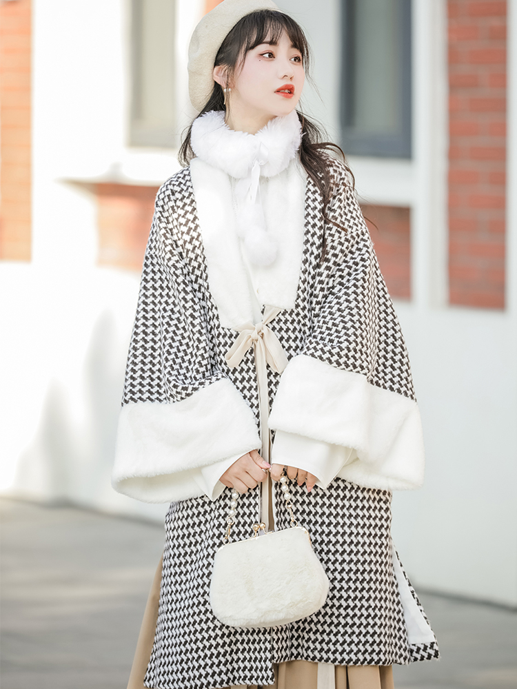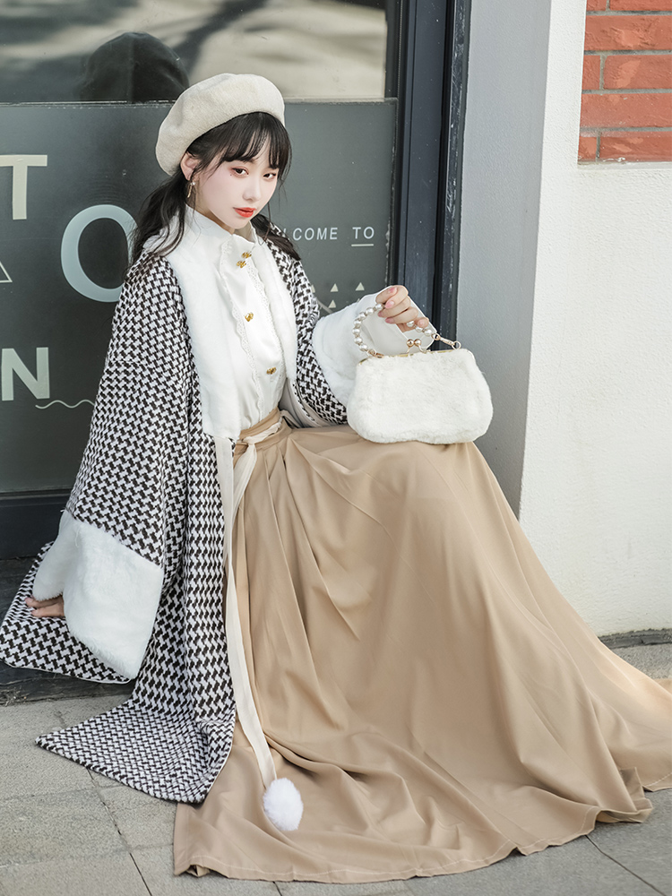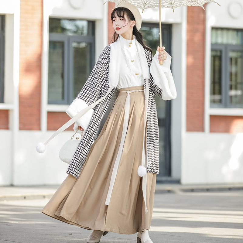 Color category: Single white lace lining, single coat, fur collar coat + blouse + pleated skirt