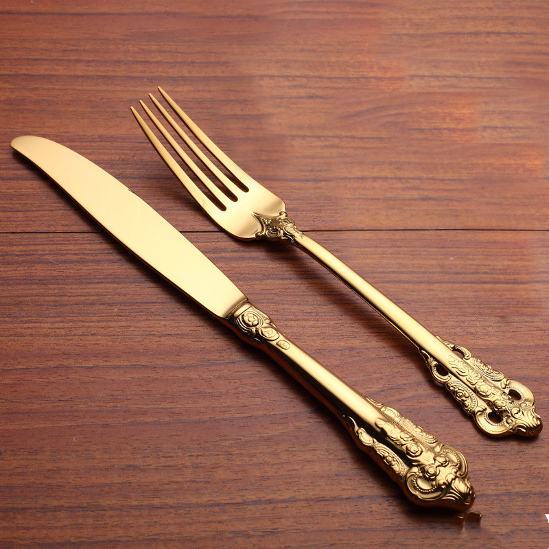 Color: A: golden dinner knife, B: golden dinner fork, C: golden dinner spoon, D: golden tea spoon, E: golden round spoon, F: golden dessert fork, G: golden dessert spoon, H: golden coffee spoon, I: Golden fruit fork, J: Golden tea fork, K: Golden small spoon (small soup shell)