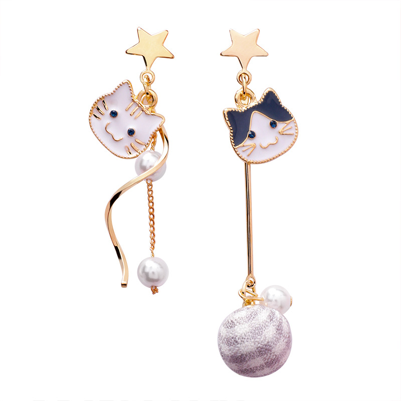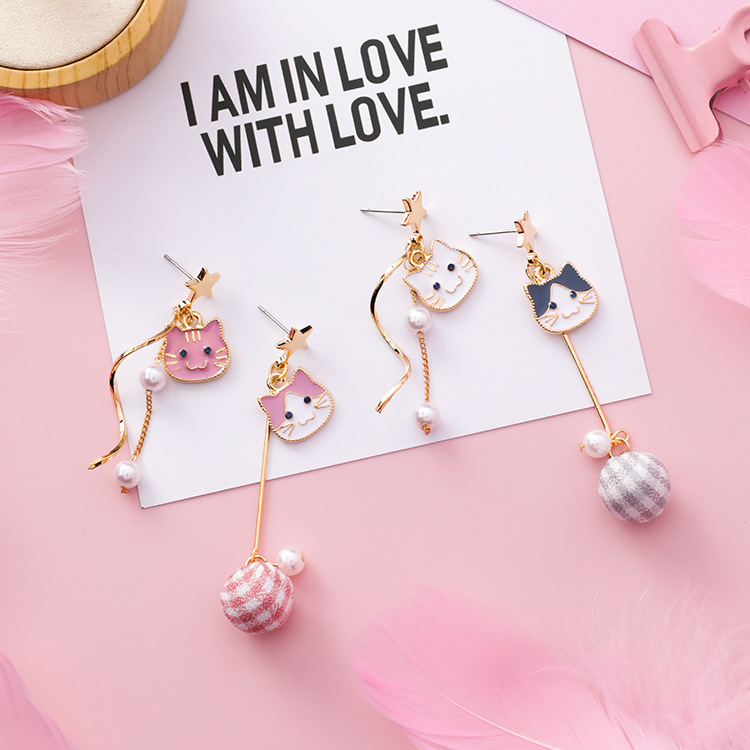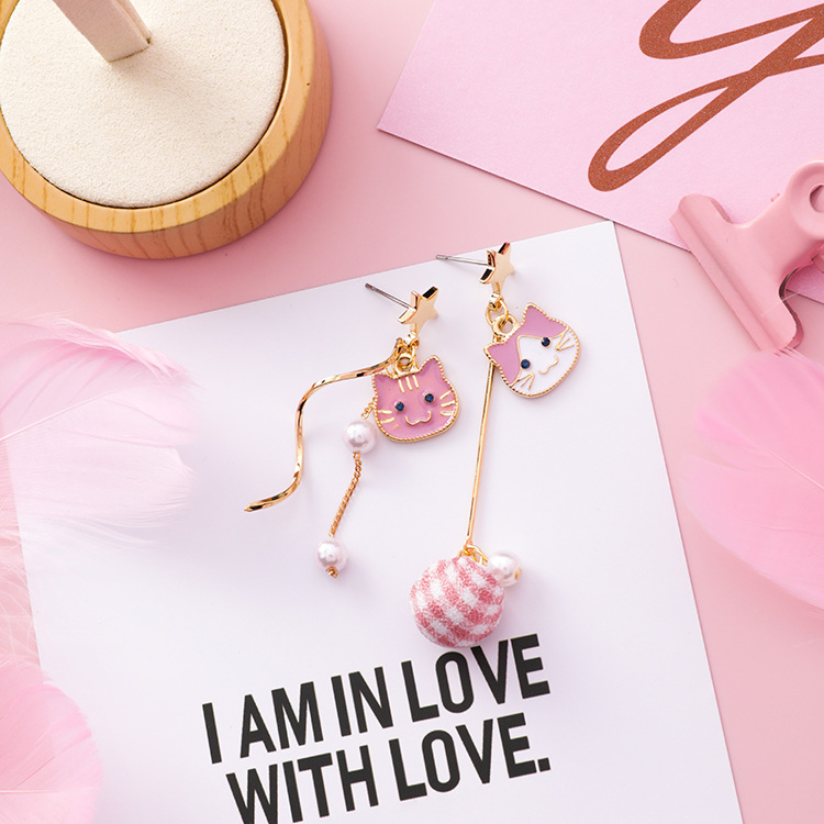 Cat Pearl Asymmetric Earrings Fabric Plaid Ball Drop Earrings