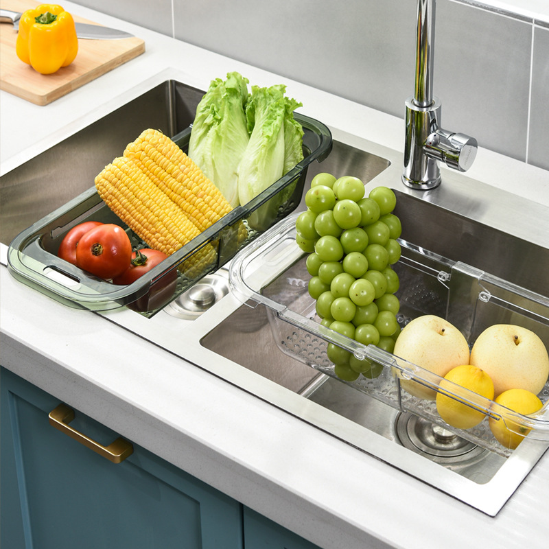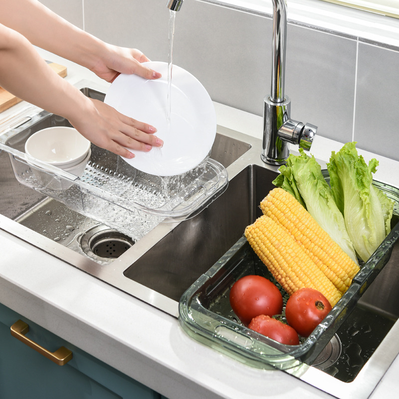 Name: Retractable drain basketMaterial: PTEApplication: Clean and store various food materials and bowls and chopsticksColor: translucent green, transparent