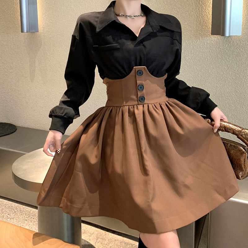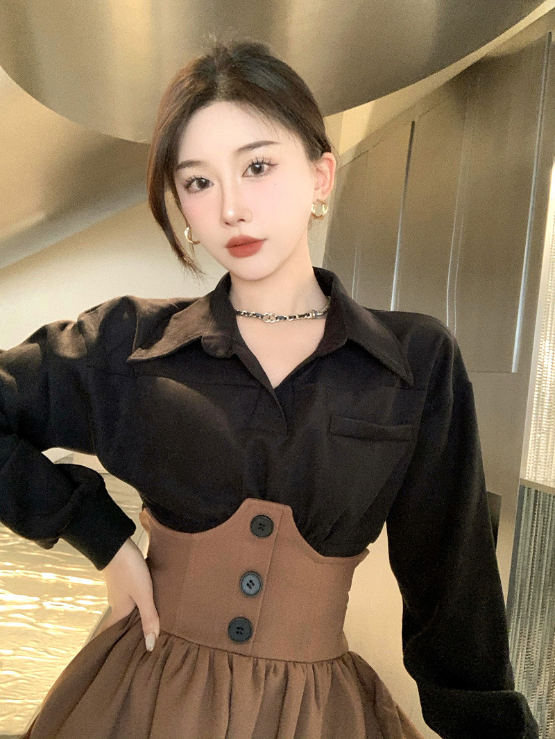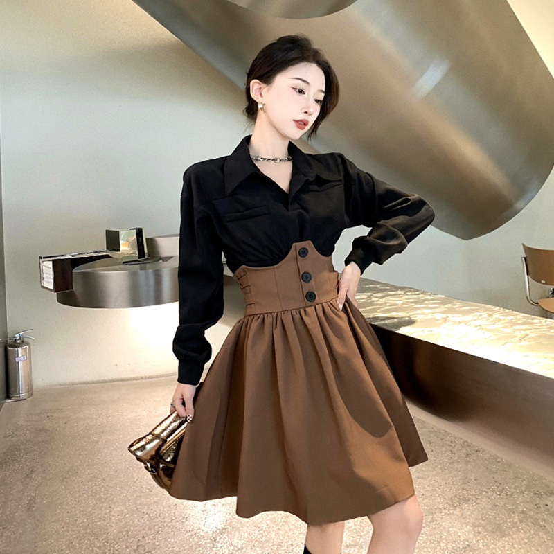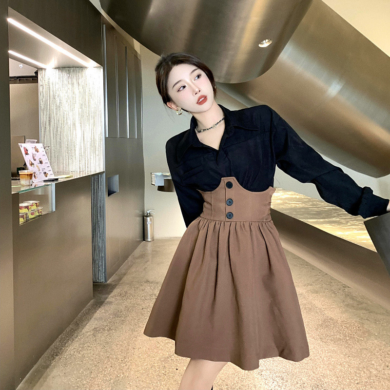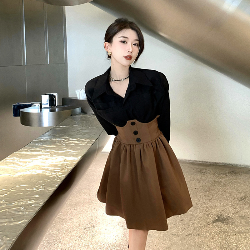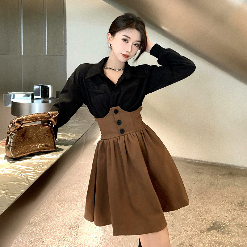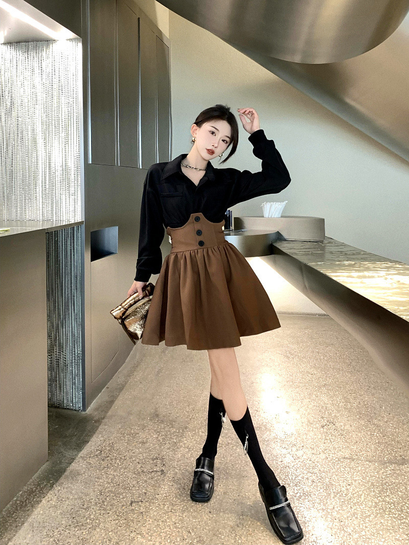 Color: black shirt + brown skirt
